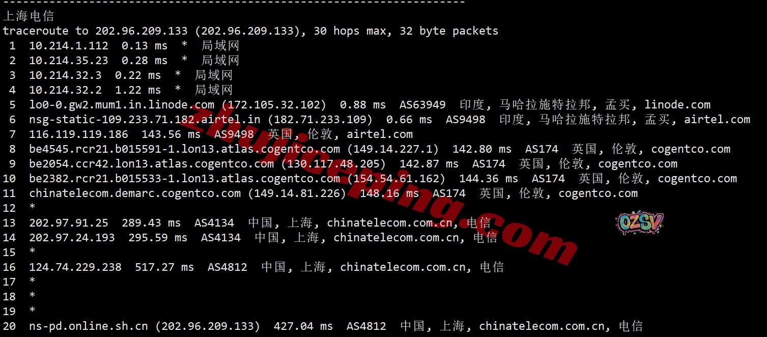 上海方向:走airtel直接去了英国,在伦敦转cogent,再从电信与cogent在伦敦的peer直连回国