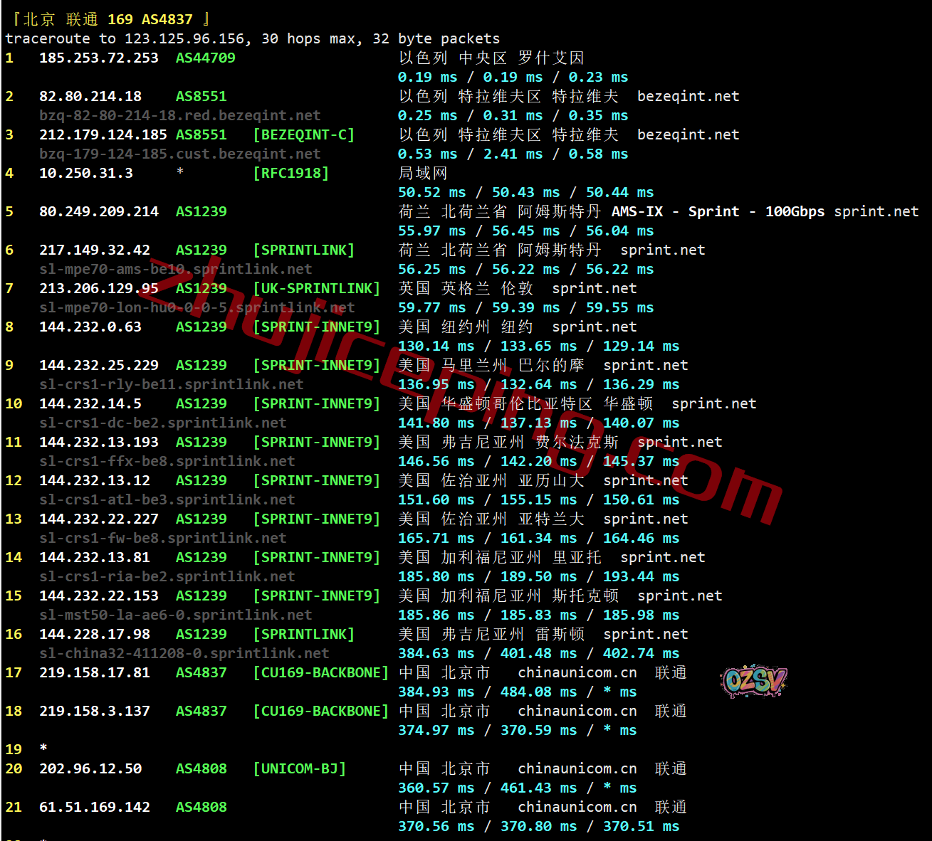 北京方向:bezeqint接sprint.net到荷兰然后去英国、美国东,再回中国