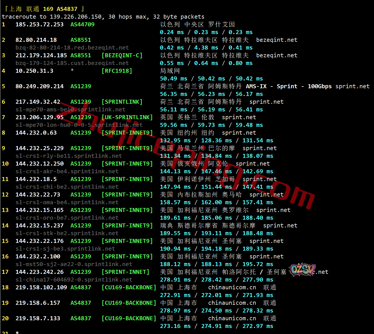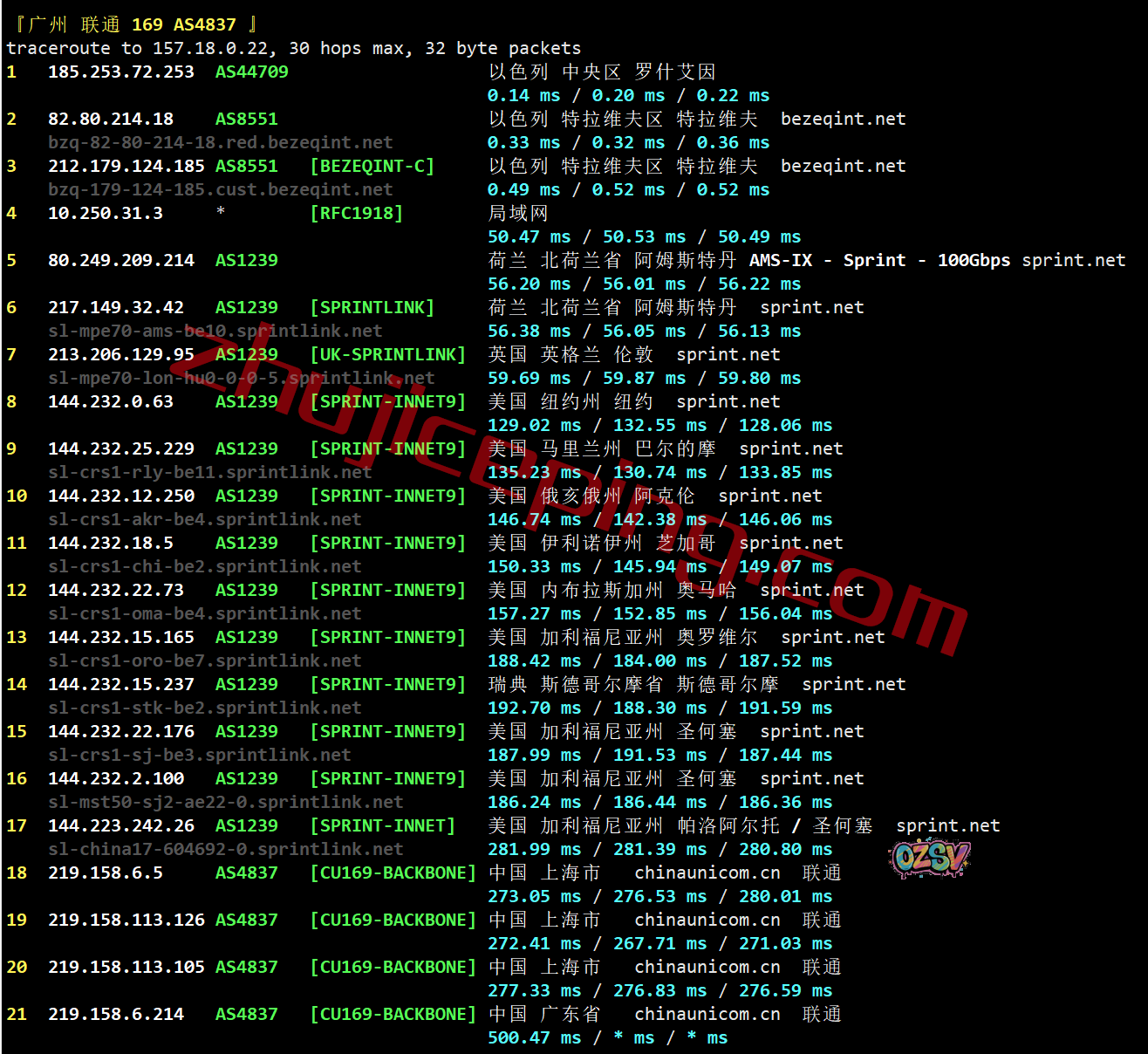 上海/广州方向:bezeqint接sprint.net到荷兰然后去英国、美国东-西,再回中国