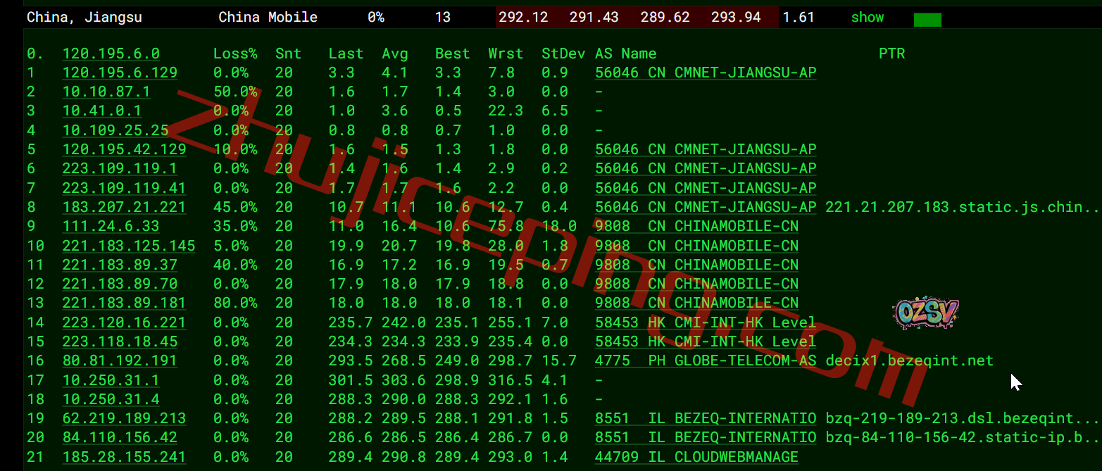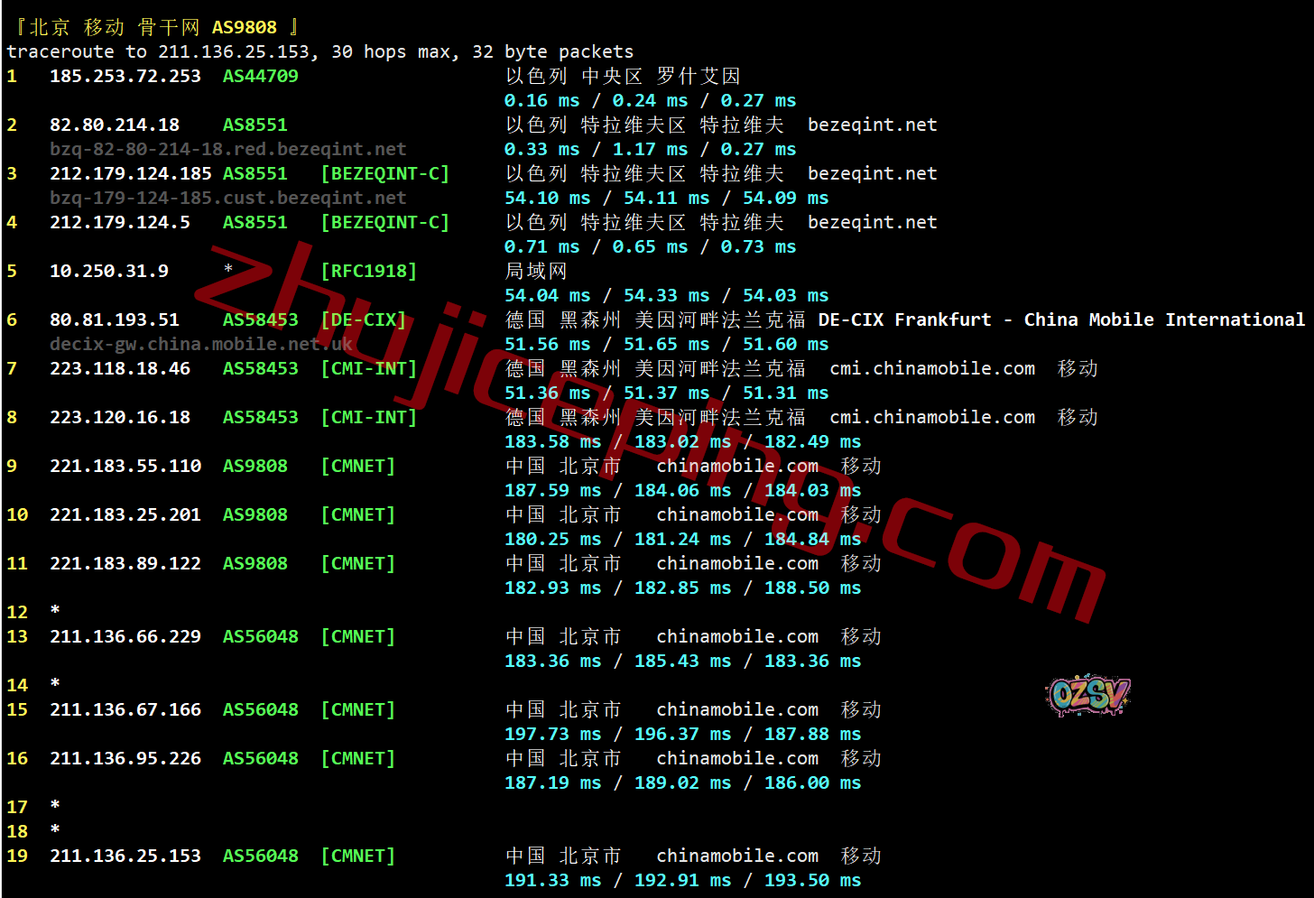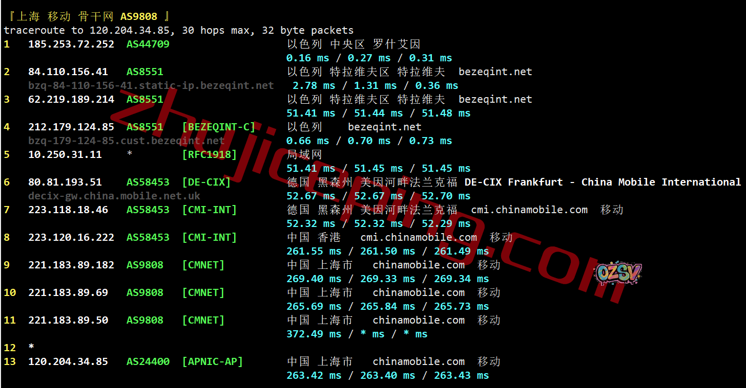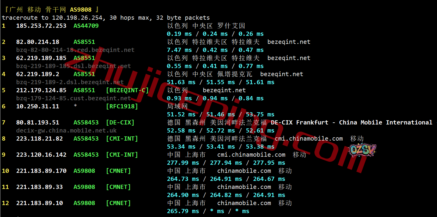 移动回程:bezeqint到德国,从移动法兰克福节点直连回国