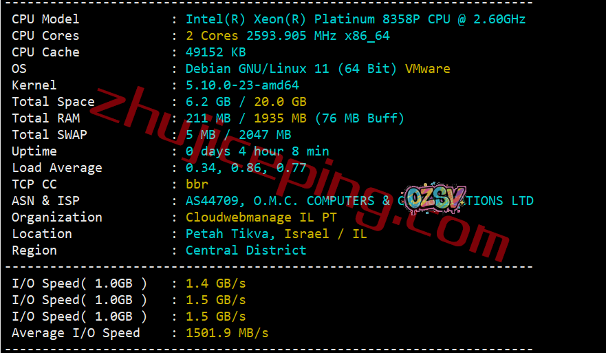 每一个机房都是用的Intel Xeon Platinum 8358P作为云服务器的CPU,21年2季度出厂,32核、64线程,主频2.6GHz\加速频率3.4GHz。站长启用了BBR,自己的ASN,归属地为以色列佩塔提克瓦中部地区,当前I/O大致1501MB/S: