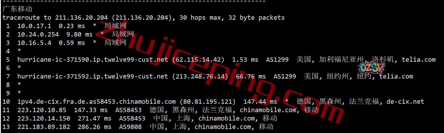 广州方向:走telia从美国东海岸出海去德国,然后从移动德国法兰克福节点直连回上海