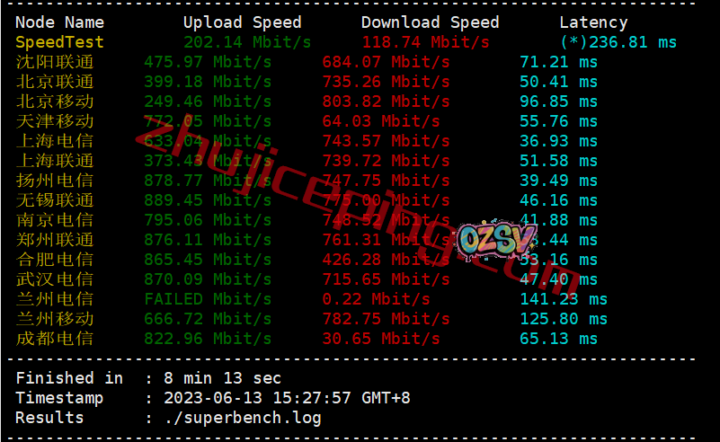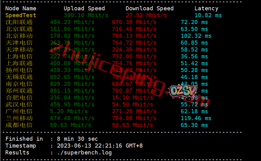 用speedtest在国内的三网多个节点跑上下行,我们看看测试的数据: