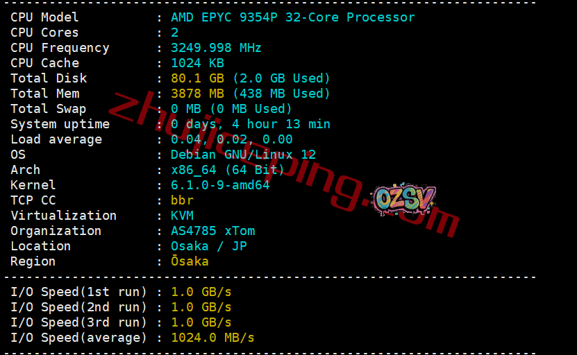 zgovps在日本大阪有提供日本高性能、软银线路的日本vps,主机测评之前写过“Osaka Ryzen Performance VPS”系列的测评,最近官方又上了Osaka EPYC Performance VPS系列,其实这个系列与前面的系列的区别就是硬件,网络上面没有任何不同。但是,还是有不少人在群内咨询,这里那就还是写个简单的测评吧,数据希望能方便大家参考!
