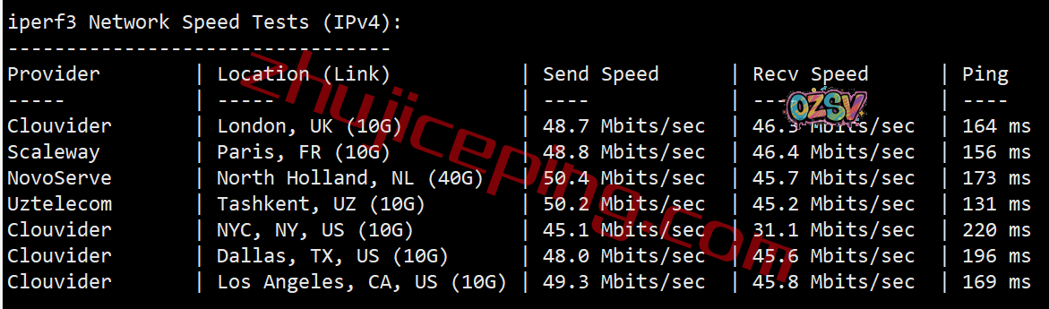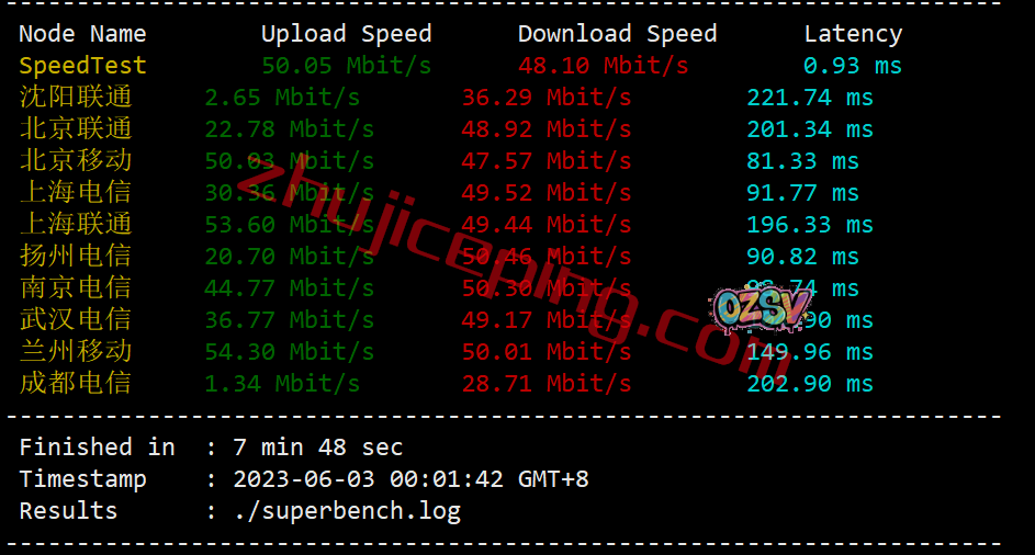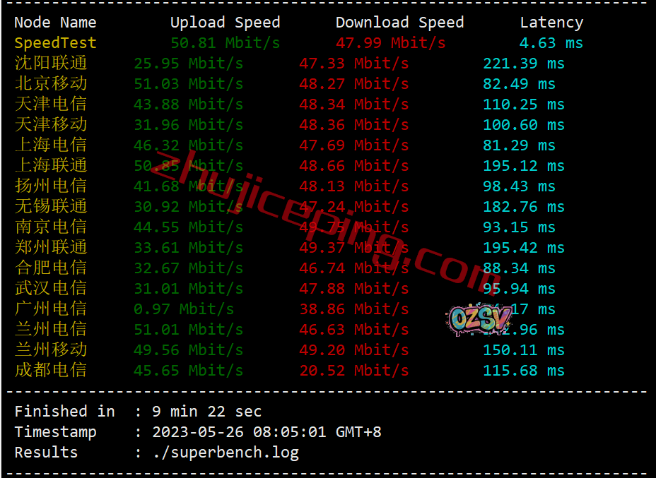 低配置的VPS给的是50Mbps带宽,我们用speedtest在国内的三网多个节点跑一下上下行,大致测试得出的结果如下: