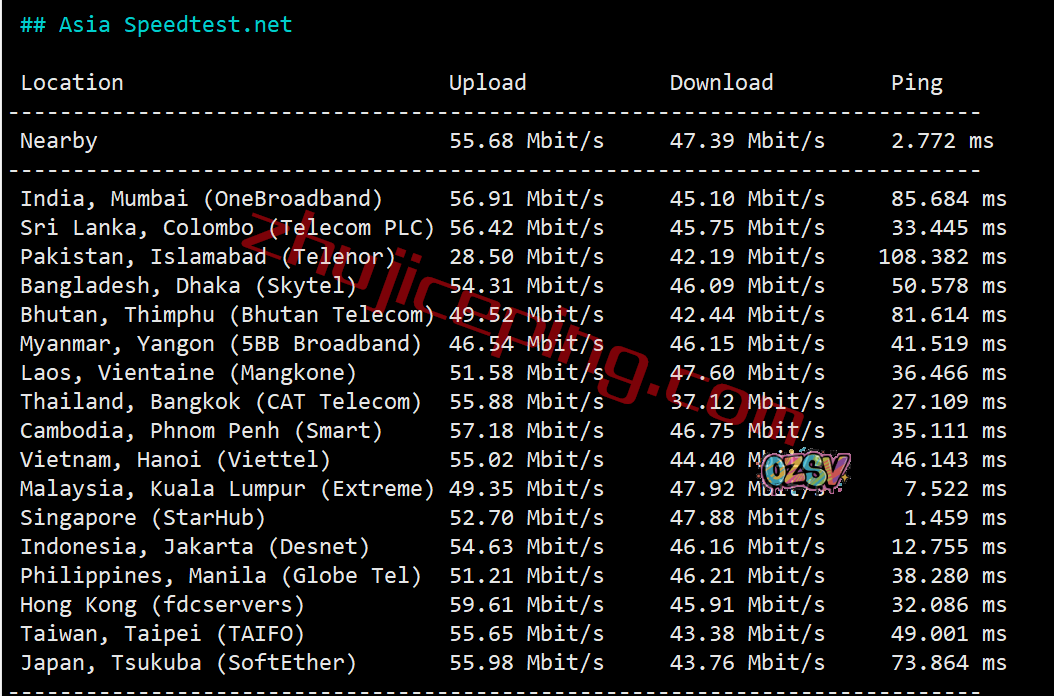speedtest的亚洲区域内的节点的测试数据: