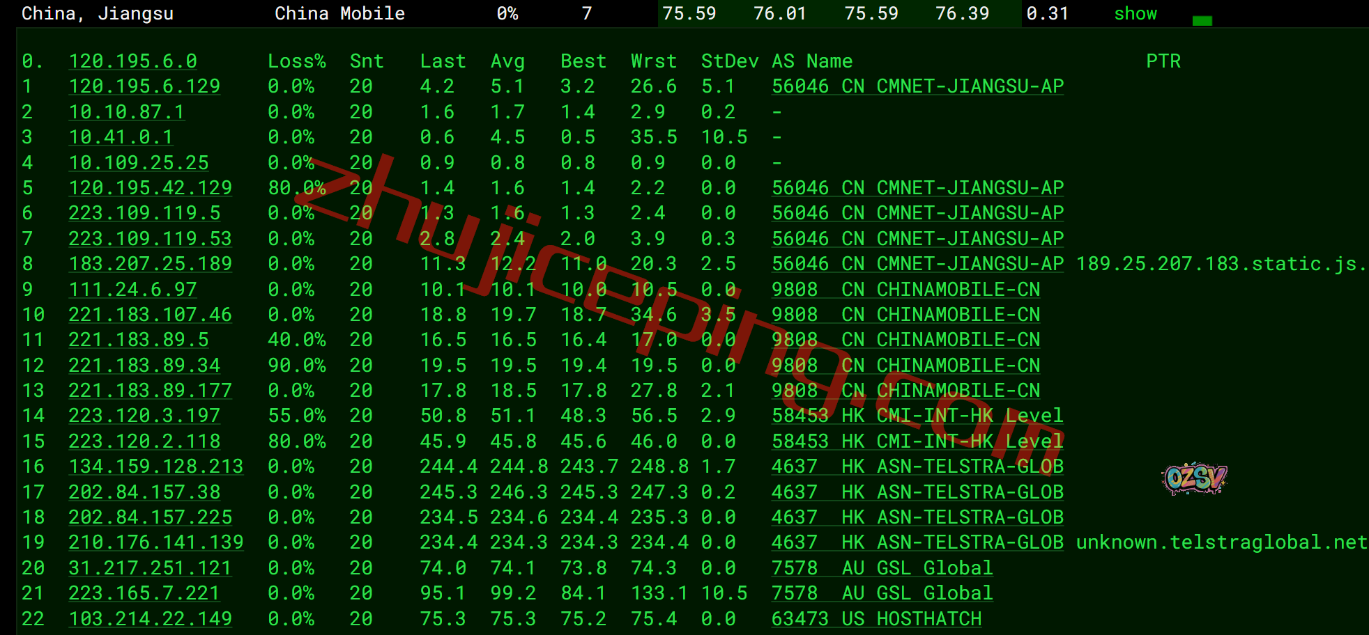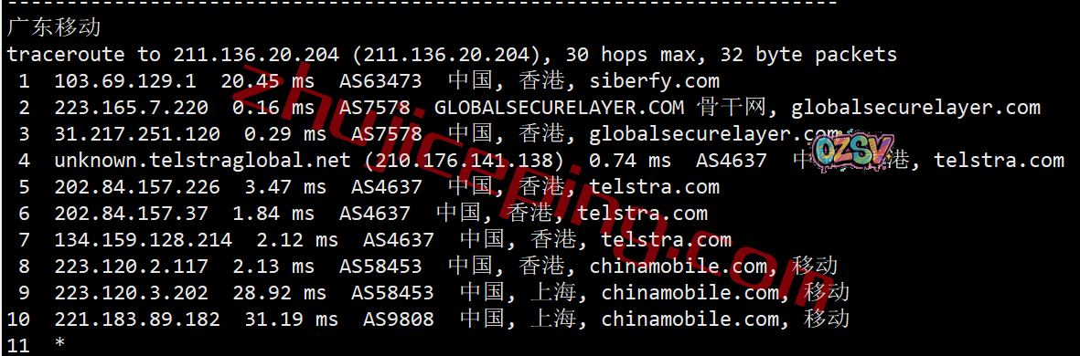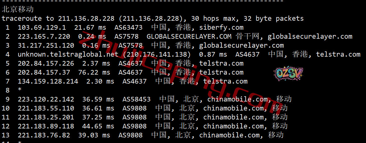 移动去程:直连香港后走Telstra去机房