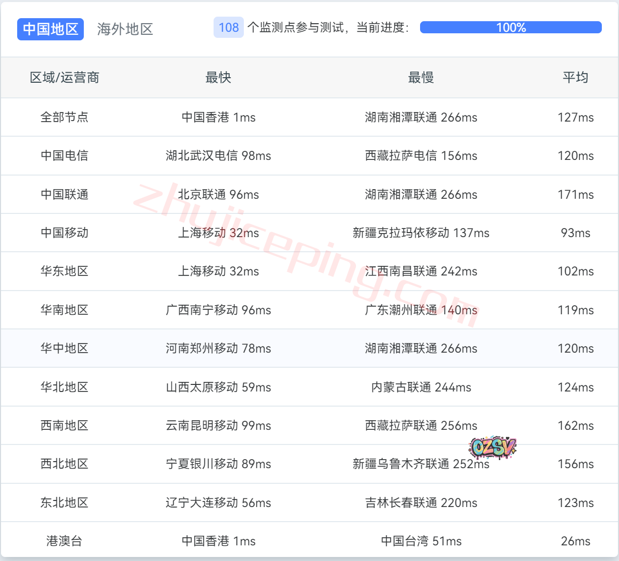 国内三网多节点的延迟测试数据: