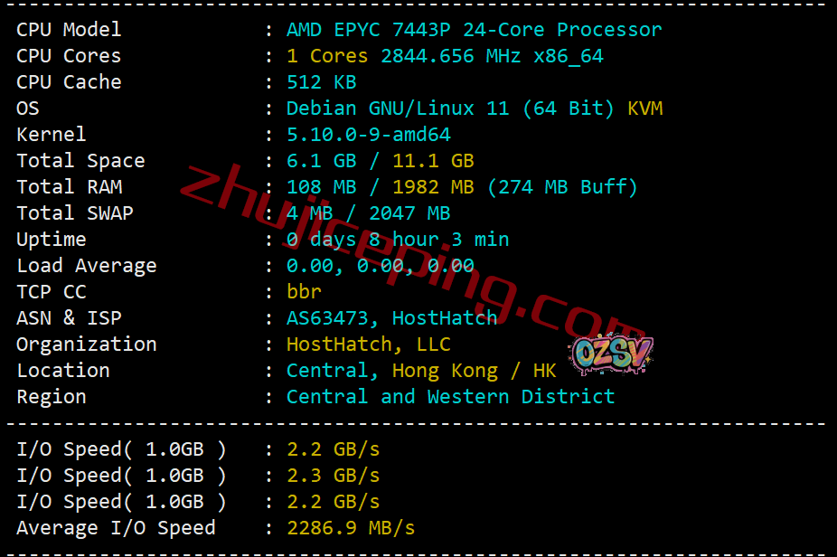 CPU型号是AMD EPYC 7443P,hosthatch自己的AS,站长启用了BBR,当前I/O大致2286MB/S的样子: