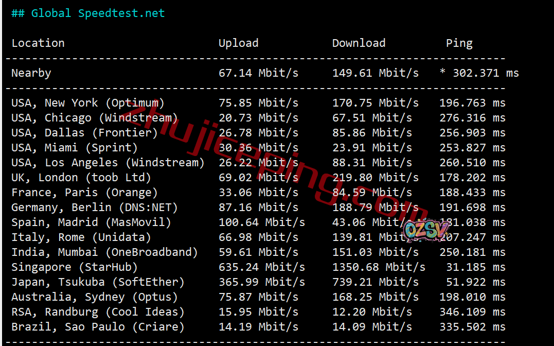 speedtest部分国际节点的数据: