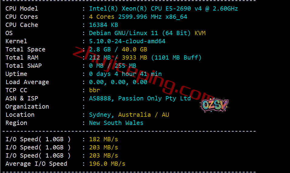 服务器用的CPU型号是e5-2690v4(一般双路,28线程、56核,主频2.6GHz、加速3.5GHz),启用了BBR,这收集狂癖好的老板弄个ASN都要8888… 归属地新南威尔士州的悉尼市,当前I/O大致196MB/S: