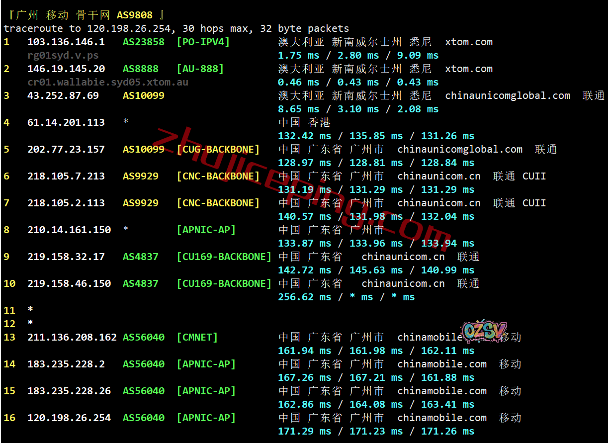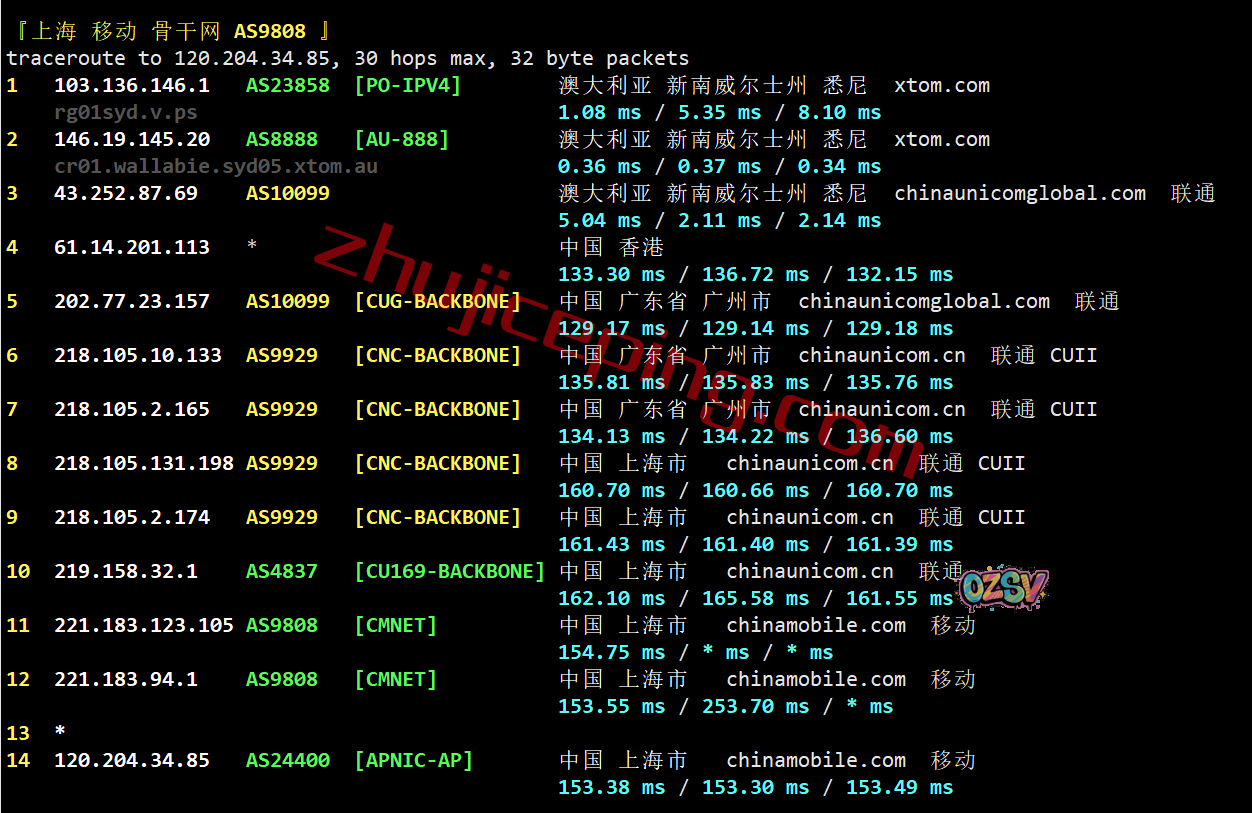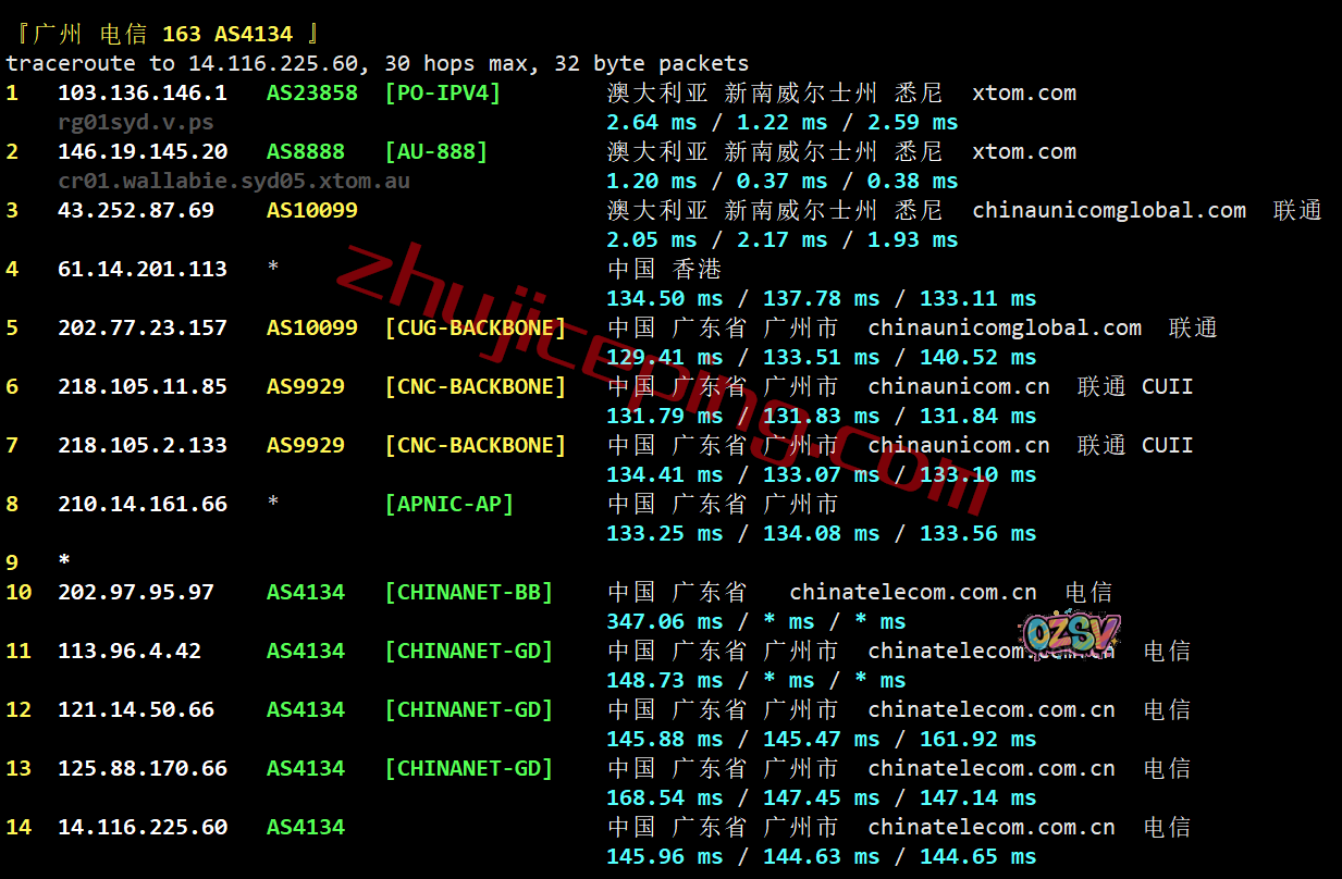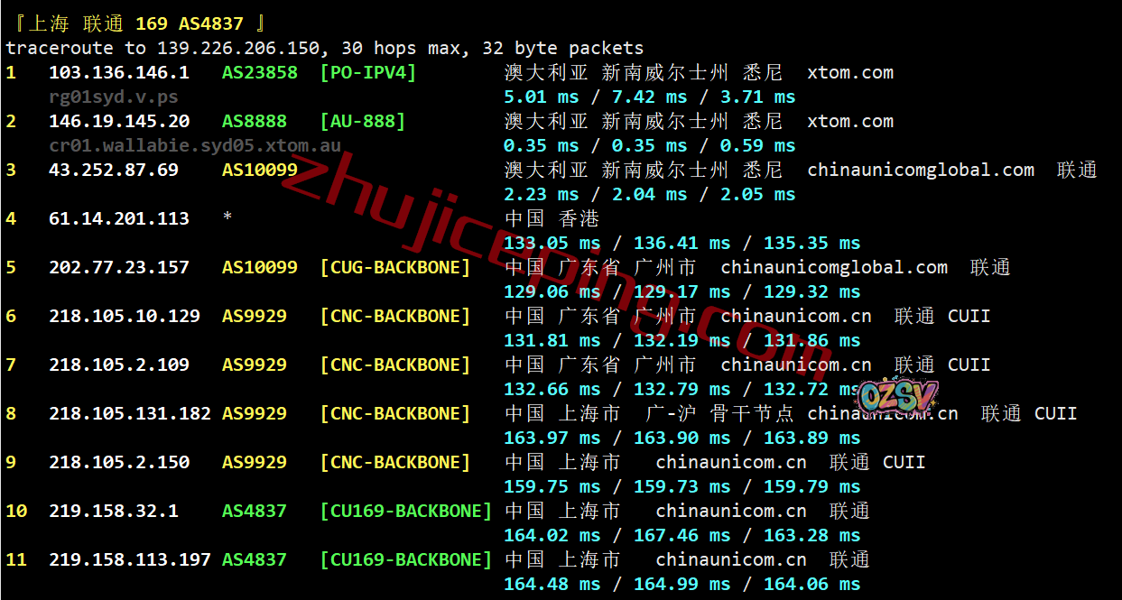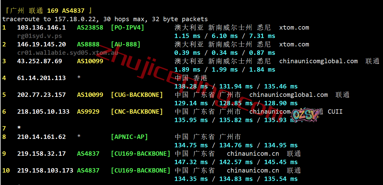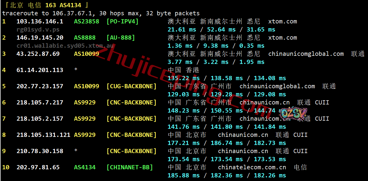 网络方便来看,电信去程走CN2、联通去程走CUII(9929)、移动从香港CMI对接Telstra去澳大利亚;回程方面,三网统一强制都是走的AS9929,所以大家不用担心速度上面的问题了。