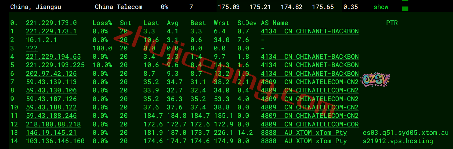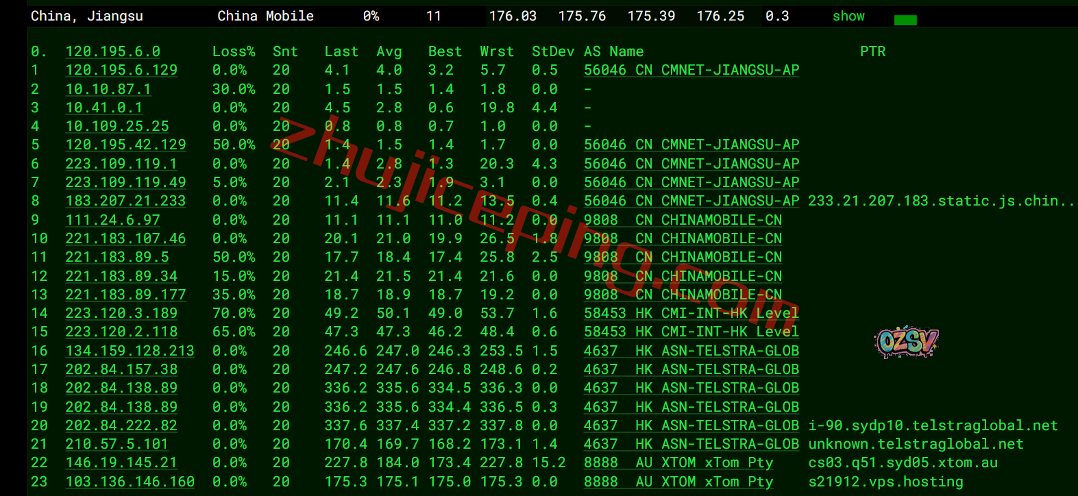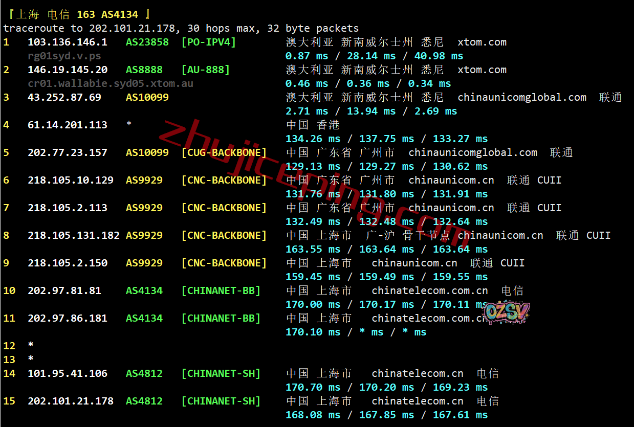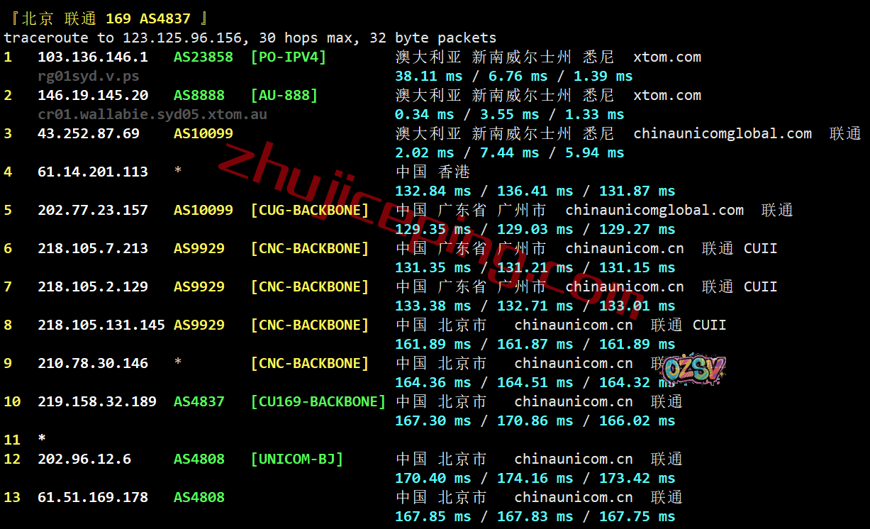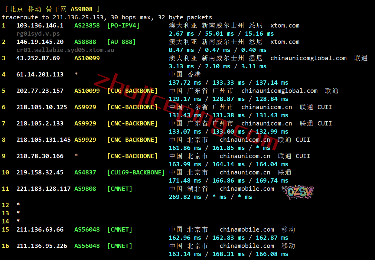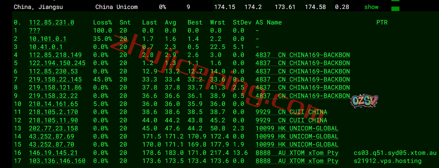 网络方便来看,电信去程走CN2、联通去程走CUII(9929)、移动从香港CMI对接Telstra去澳大利亚;回程方面,三网统一强制都是走的AS9929,所以大家不用担心速度上面的问题了。