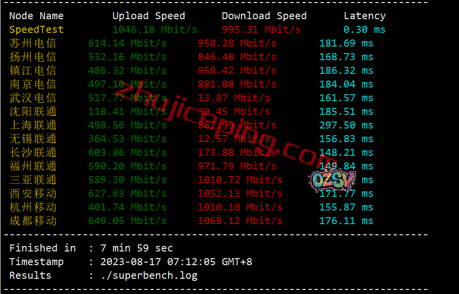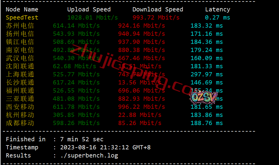 用speedtest的国内三网部分节点跑一圈上下行,看看能冲到多少吧?如下: