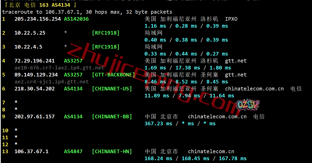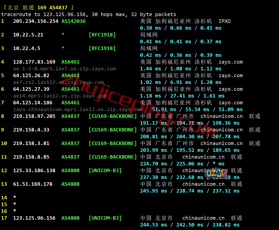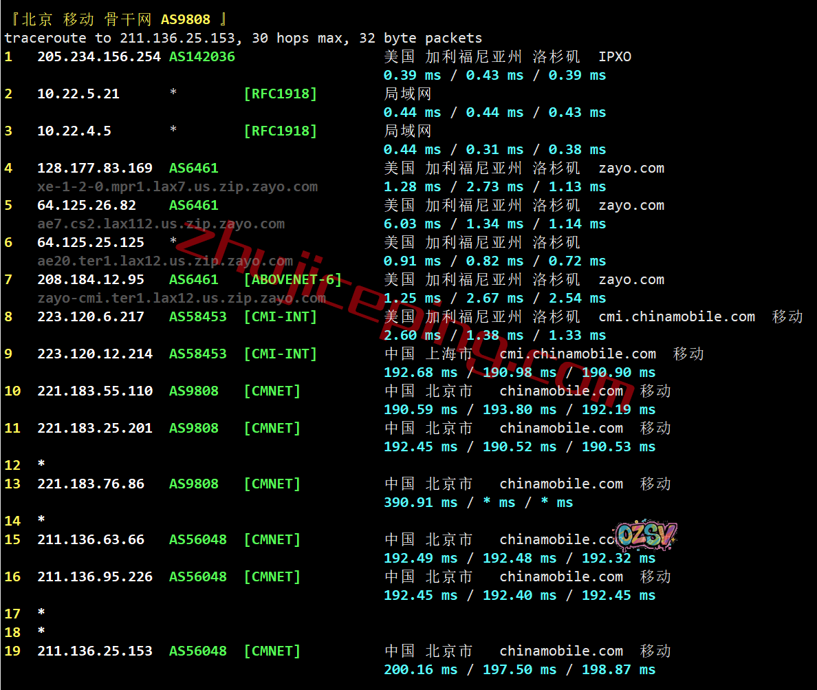 北京方向:走zayo对接移动洛杉矶节点,直连回国