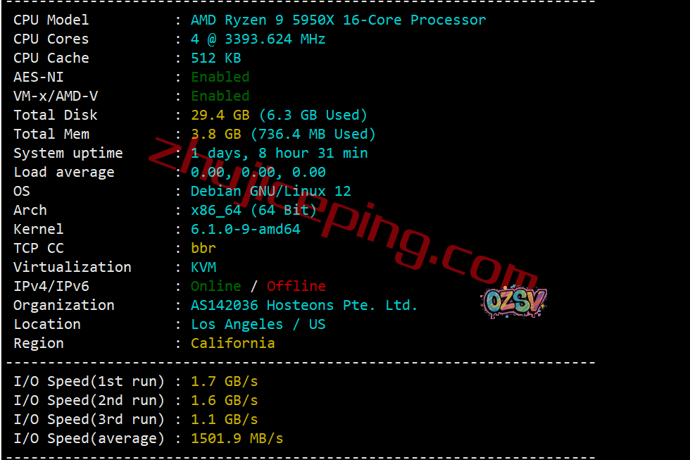 CPU型号已经换成了AMD Ryzen 9 5950X(16核、32线程、主频3.4GHz、加速频率4.9GHz),自家的ASN,启用了BBR,归属地洛杉矶,当前I/O大致1501MB/S的样子: