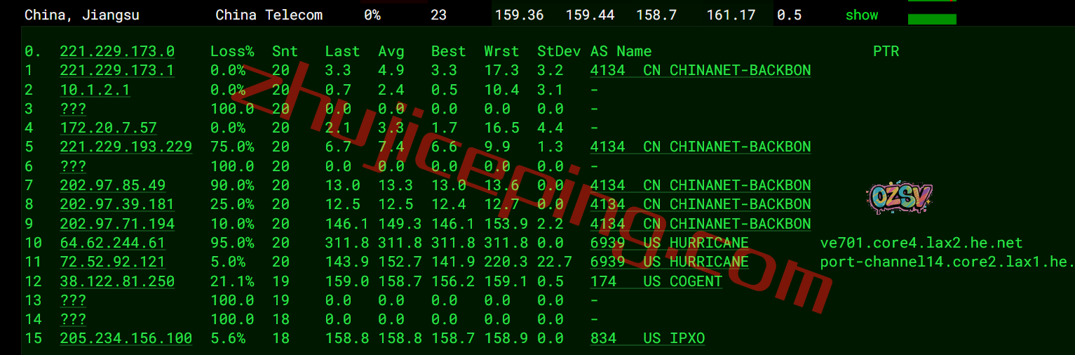 电信去程:直连电信洛杉矶节点,然后走HE.NET接cogent去机房