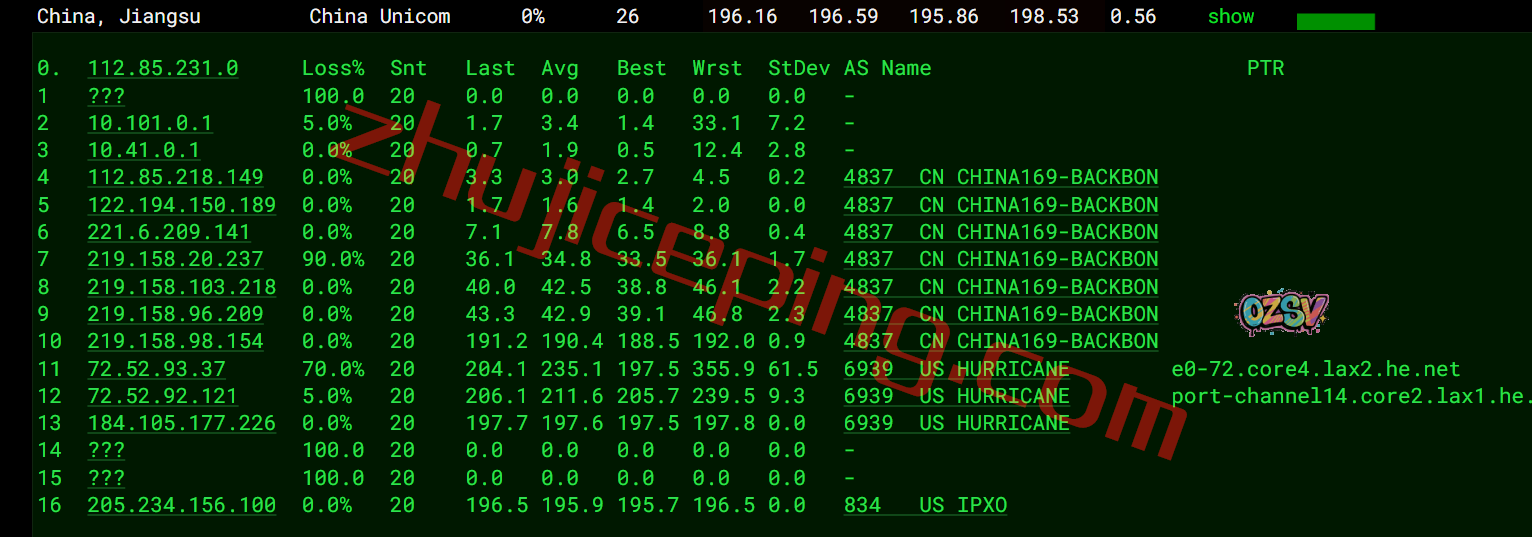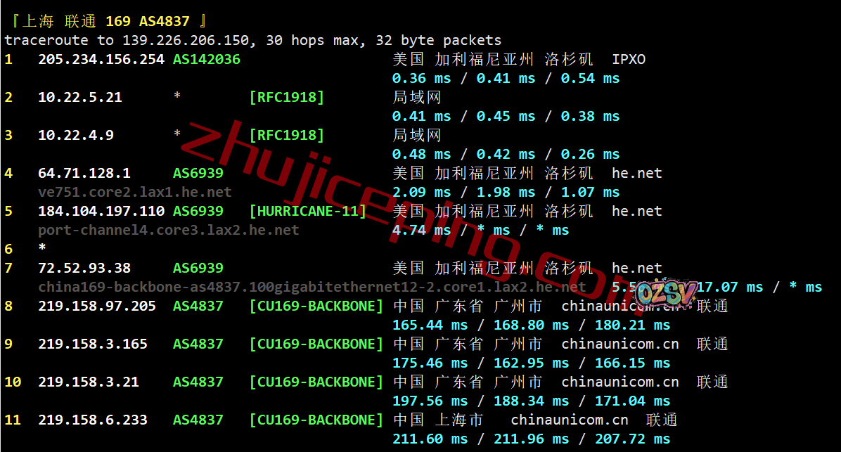 联通去程:直连联通洛杉矶节点,然后走HE.NET去机房