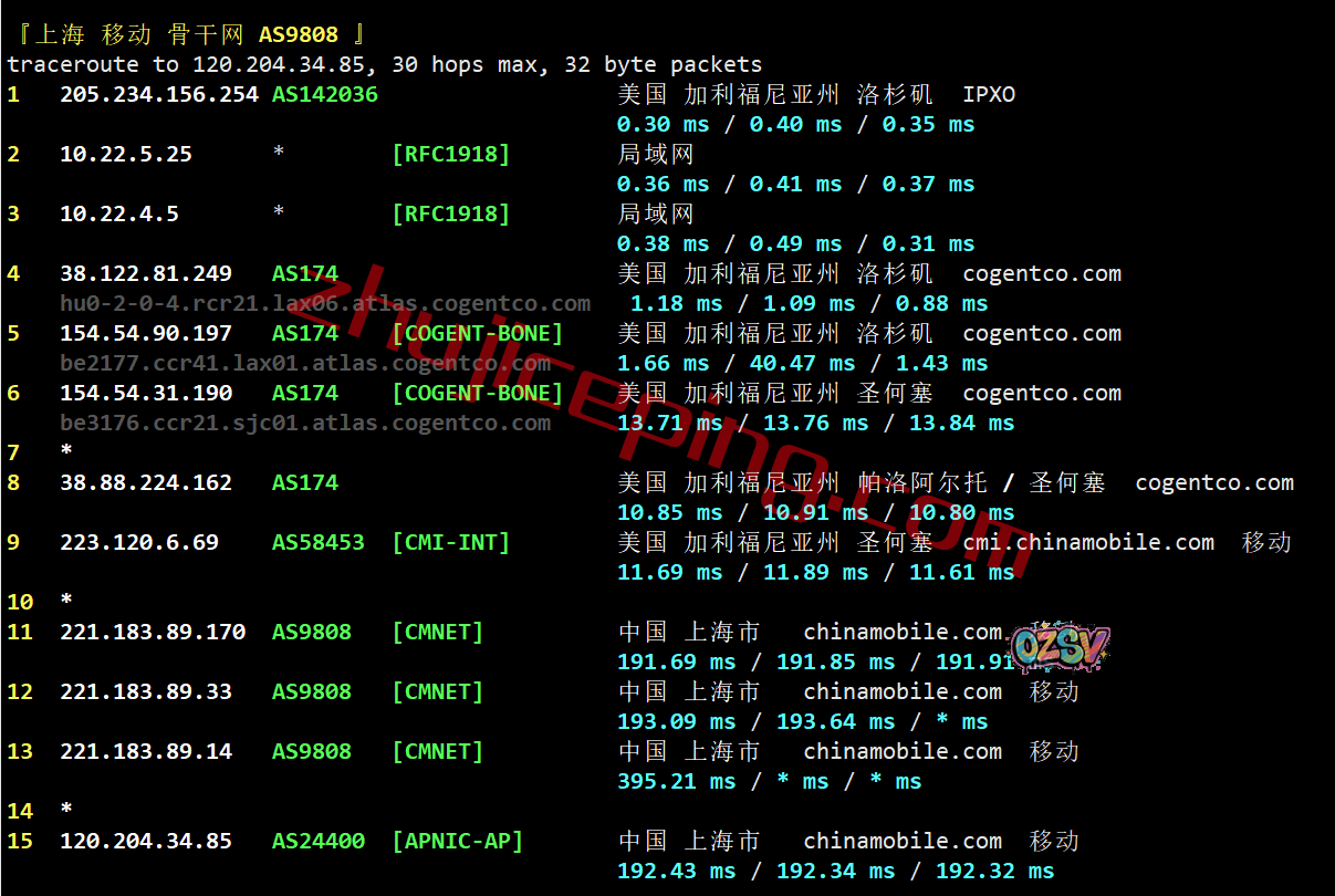 上海方向:上海方向:走cogent到审核赛,从移动圣何塞节点直连回国