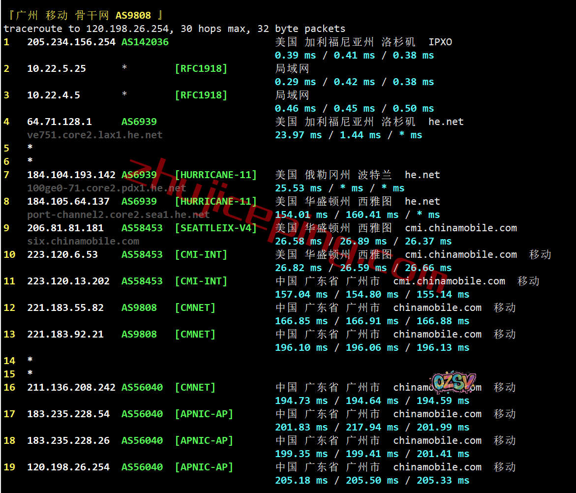 广州方向:走he.net到 波特兰再去西雅图,从移动西雅图节点直连回国