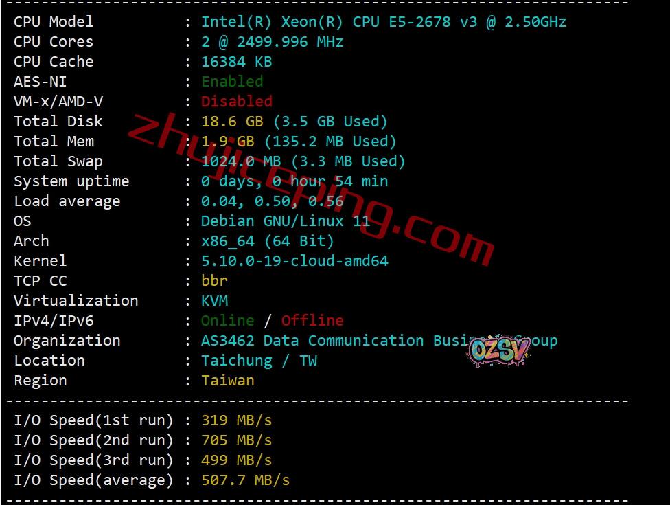 CPU采用的是e5-2678v3(单路12核24线程、2.5GHz主频),站长启用了BBR,归属地台湾,当前硬盘I/O大致507MB/S: