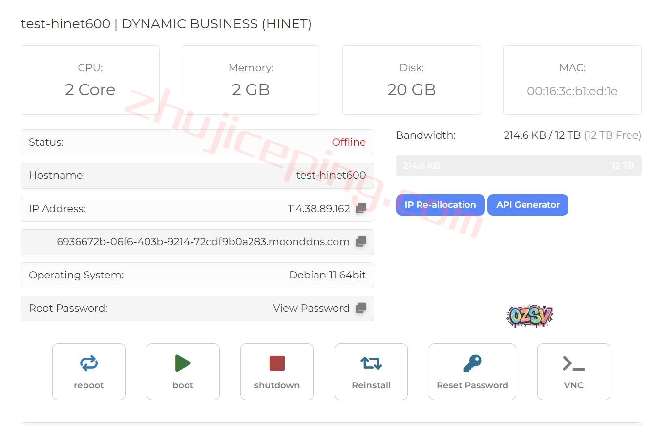 我们能看到支持重启、启动、关机、重装、修改root密码、VNC,有流量显示、MAC地址,