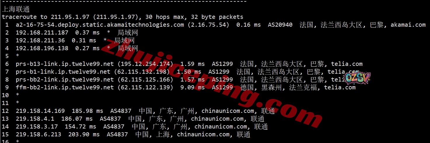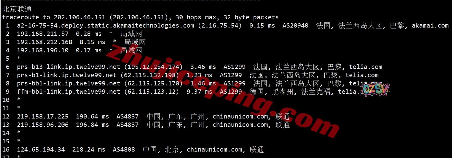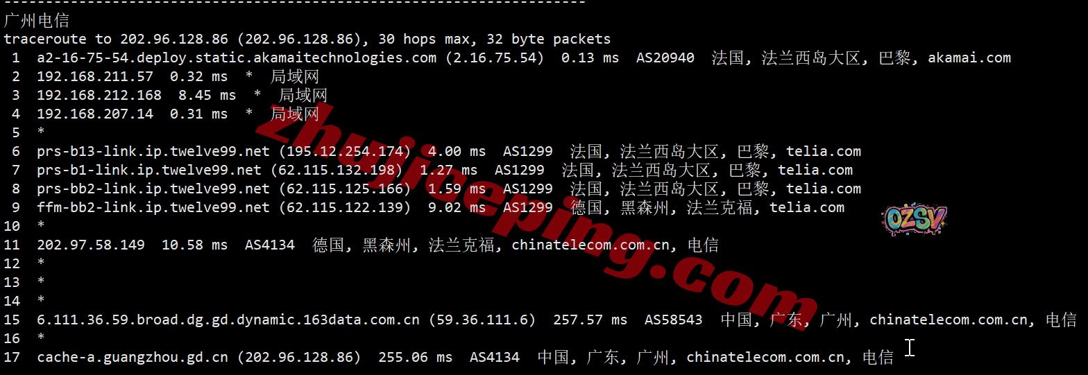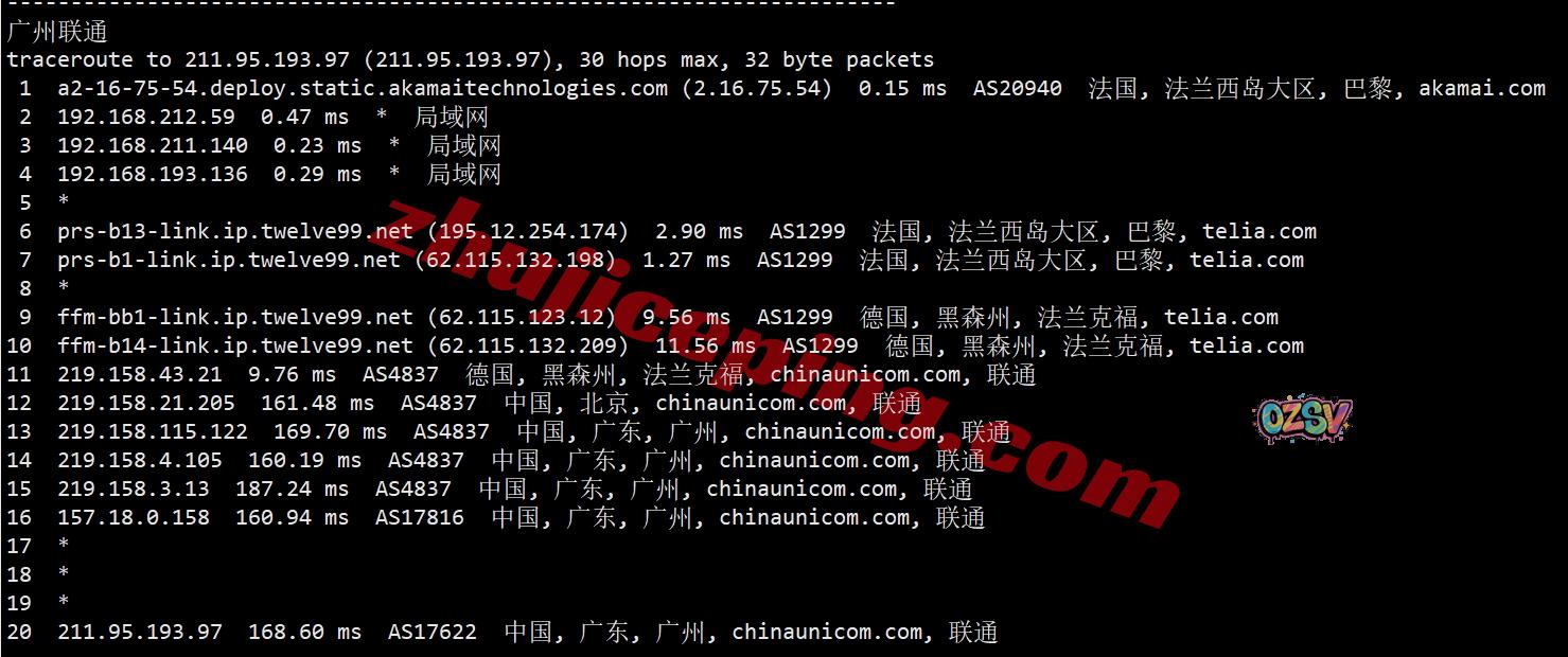 广州方向:走telia经过德国法兰克福,从联通法兰克福节点直连回国