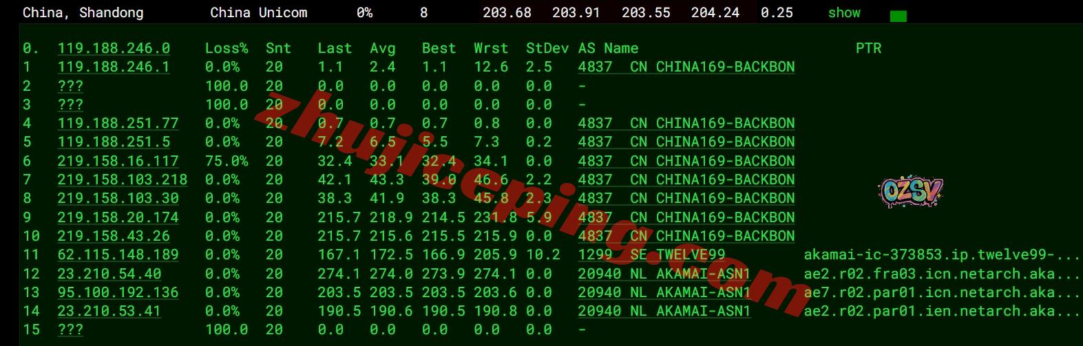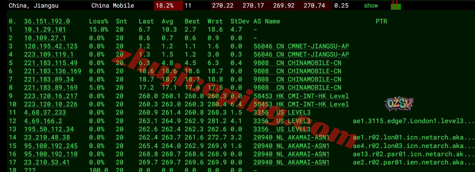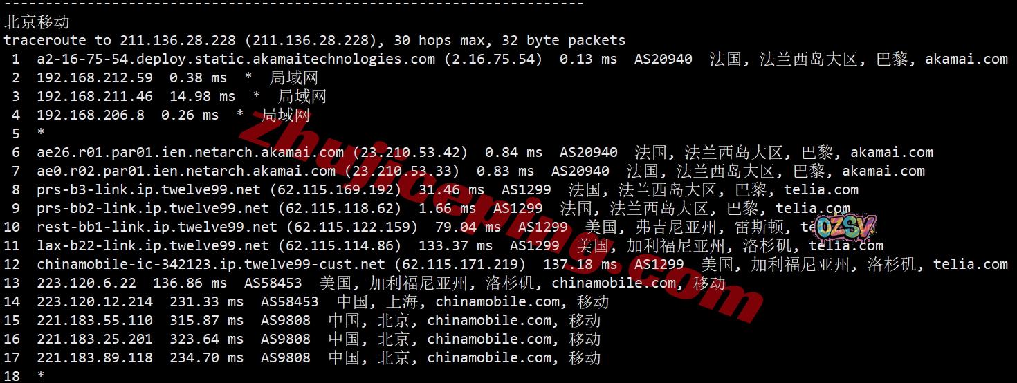 移动去程:直连移动英国伦敦节点然后走level3接akamai自己的网络去机房
