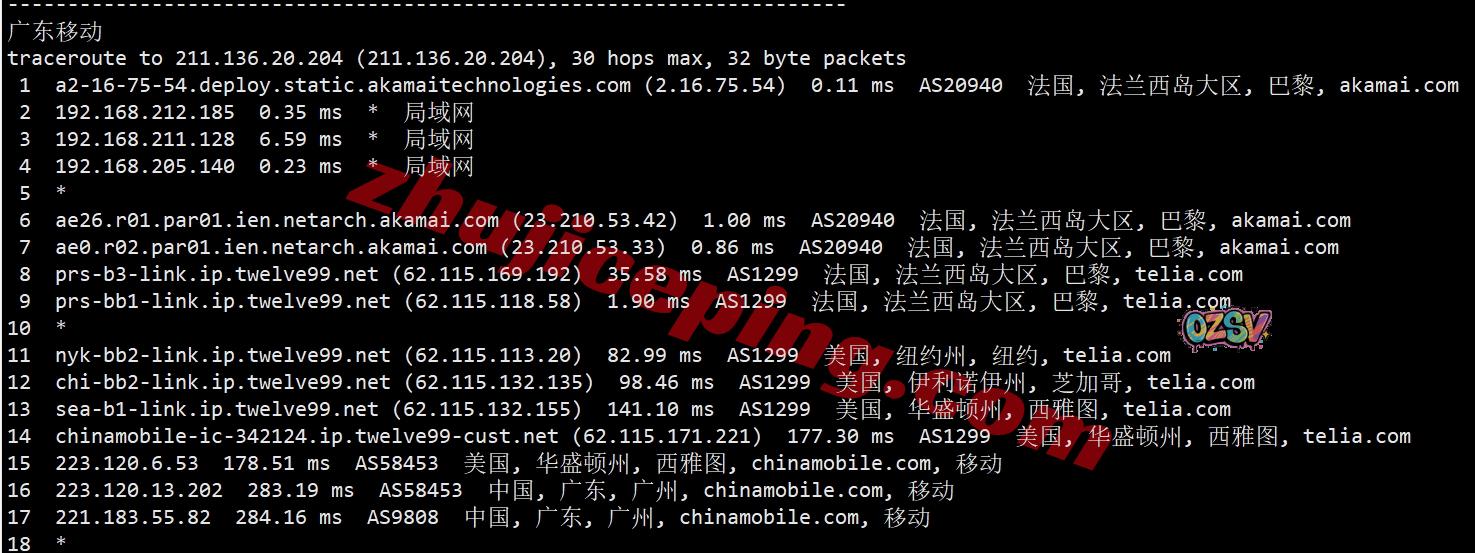 广州方向:走telia到美国东海岸,然后去西海岸西雅图,然后后移动西雅图节点直连回国