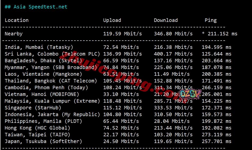 speedtest亚洲区域内的节点测试数据如下: