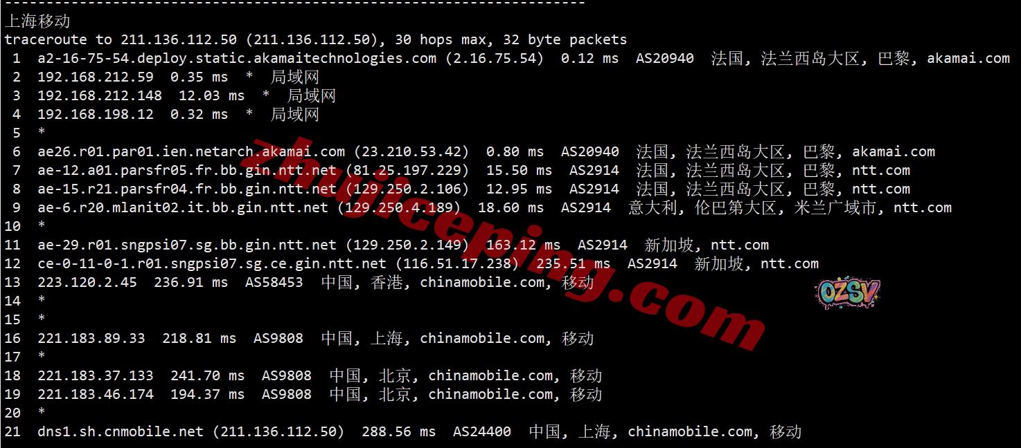 上海方向:走NTT经过意大利、新加坡、香港,从移动香港节点直连回内地