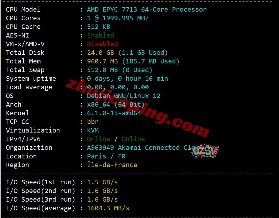 AMD EPYC 7713(64核、128线程、主频2.0GHz、加速频率3.675GHz),站长启用了BBR,支持IPv6,IP归属法国巴黎,当前硬盘I/O大致1604MB/S: