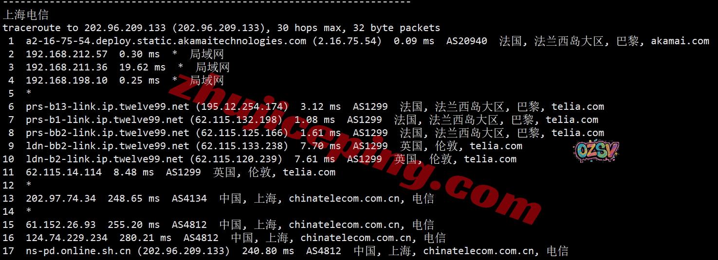 上海方向:走telia经过英国伦敦出海去中国内地