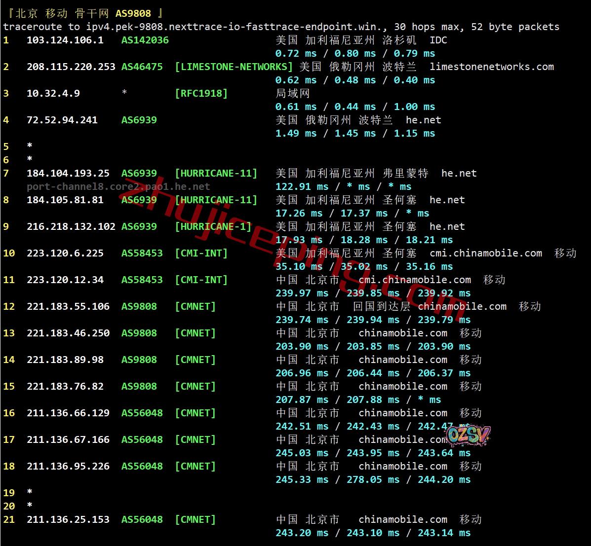 北京方向:走HE.NET到圣何塞,从移动圣何塞节点直连回国