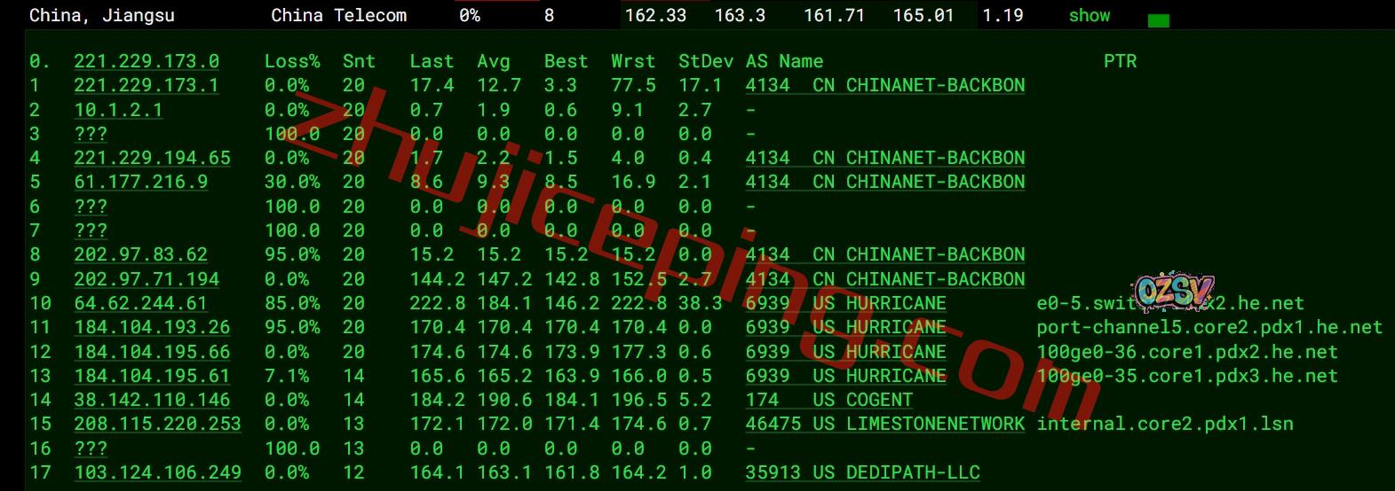 电信去程:直连电信洛杉矶节点,然后转HE.NET去波特兰