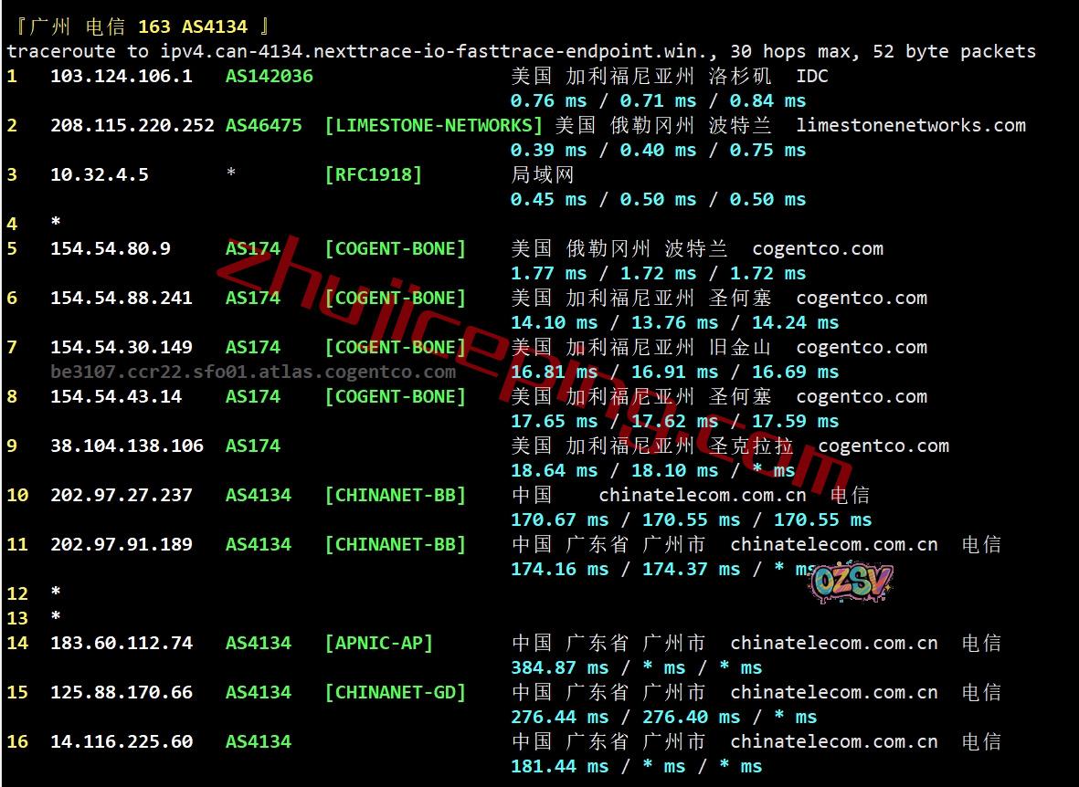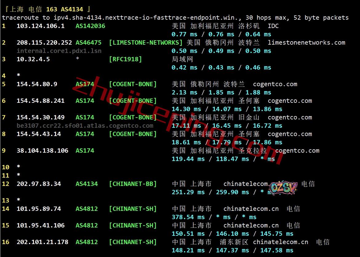 电信回程:走cogent去圣何塞出海回国,纯国际线路