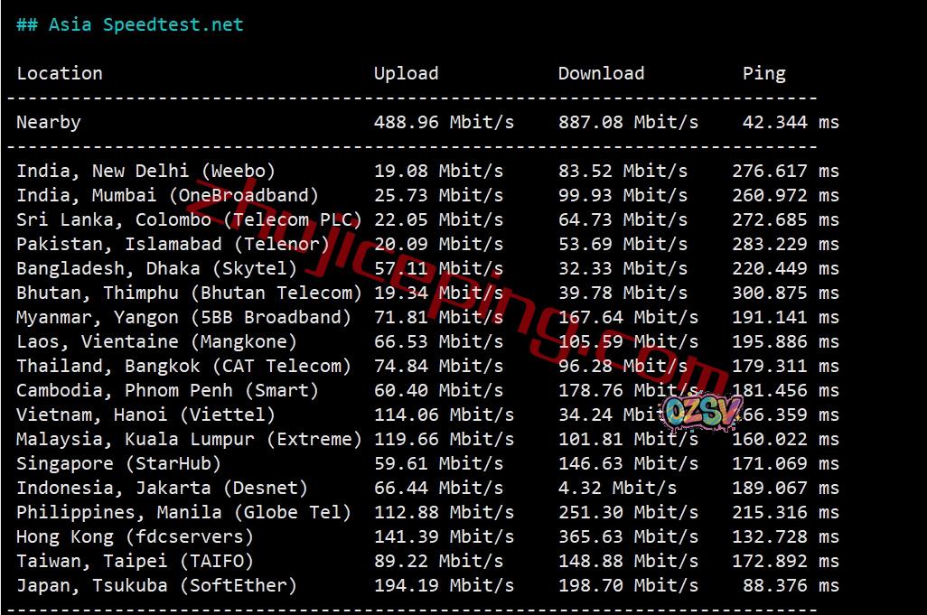 speedtest的部分亚洲节点的测试数据: