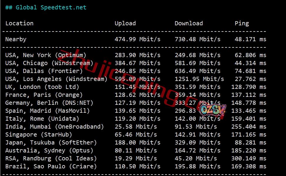 speedtest的部分国际节点测试效果: