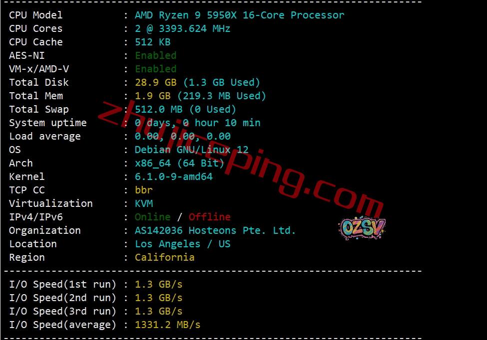 默认的CPU型号为AMD Ryzen 9 5950X(16核、32线程、主频3.4GHz、加速频率4.9GHz),自家的ASN,启用了BBR,归属地洛杉矶(数据未更新),当前I/O大致1331MB/S的样子: