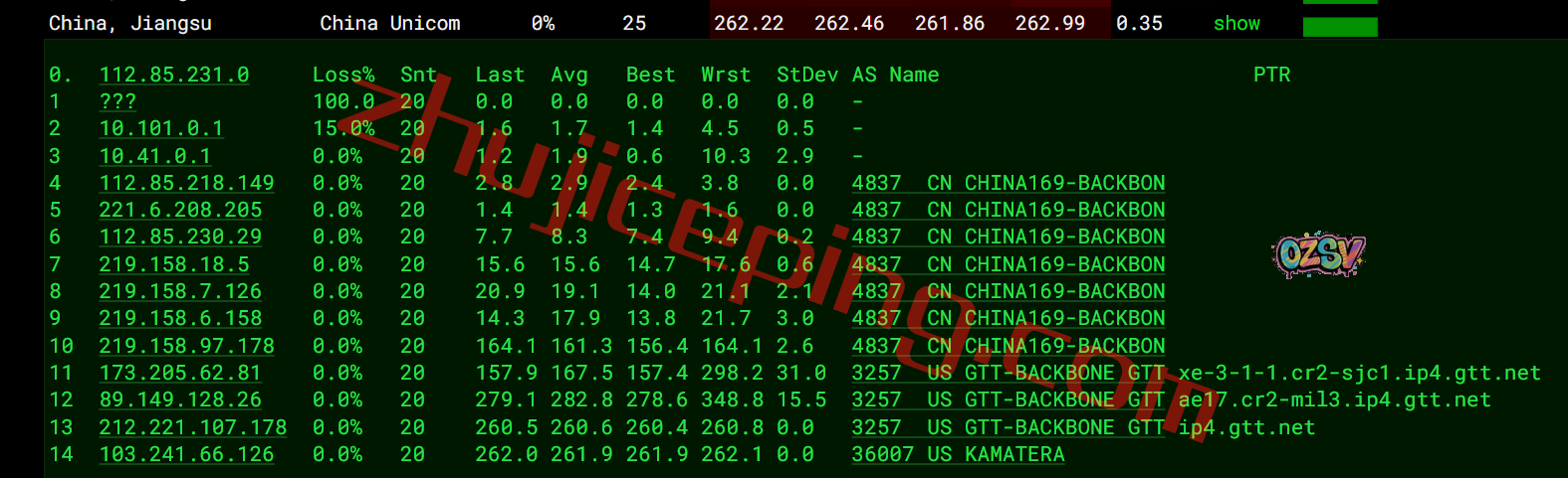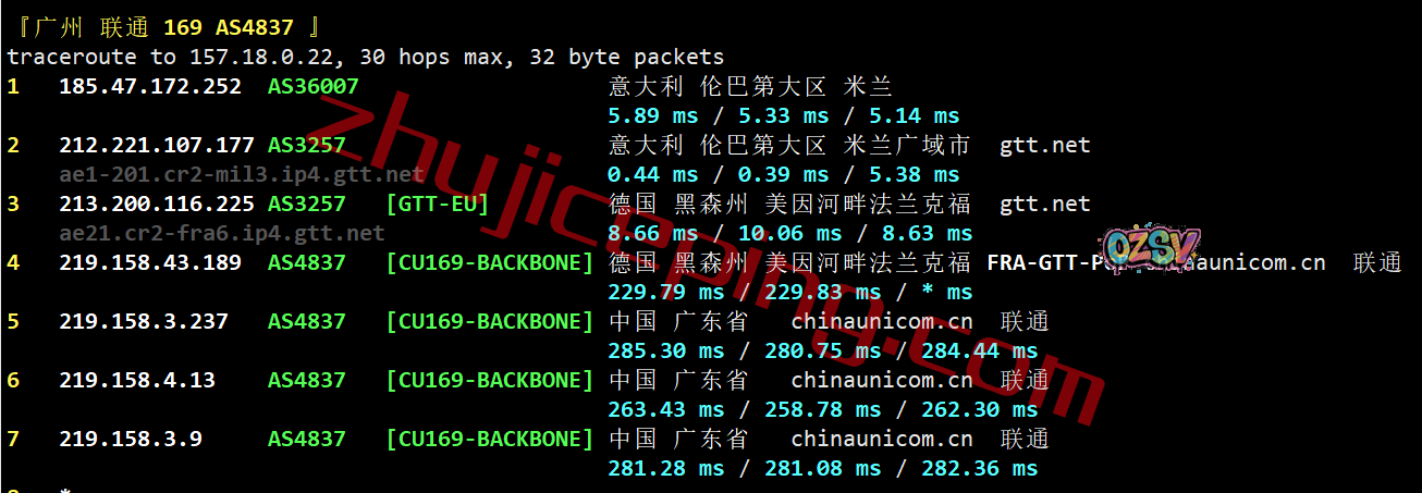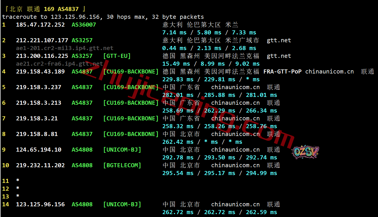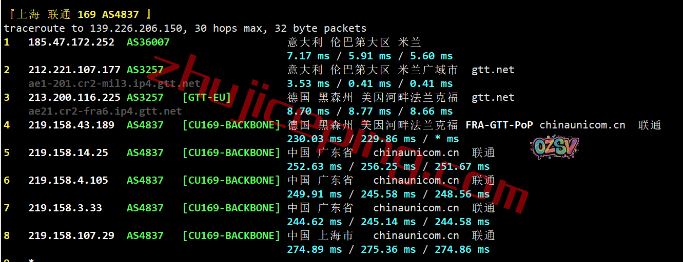 联通回程:走GTT到达德国法兰克福,从联通法兰克福节点直连回国