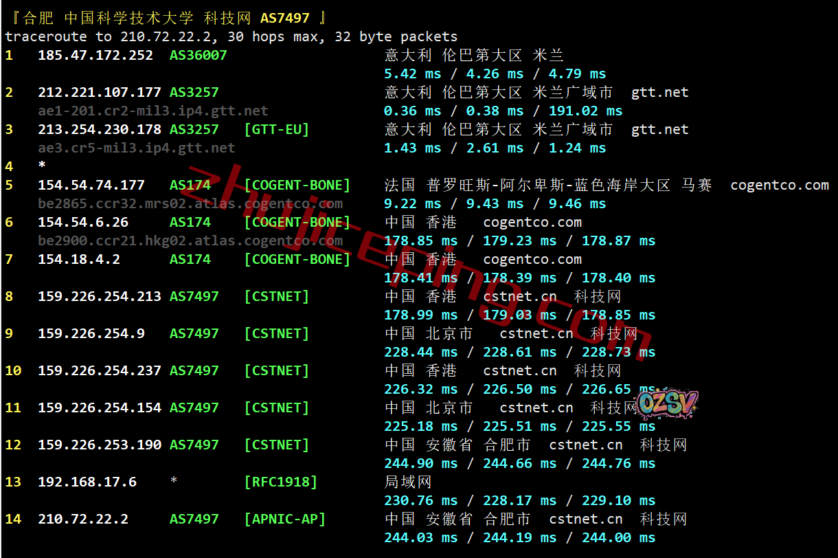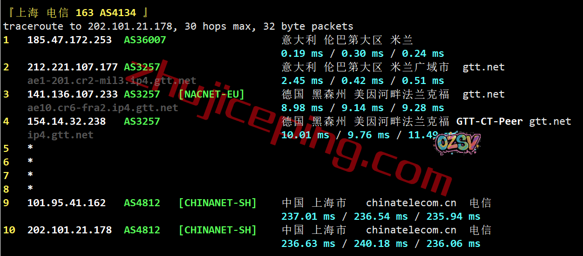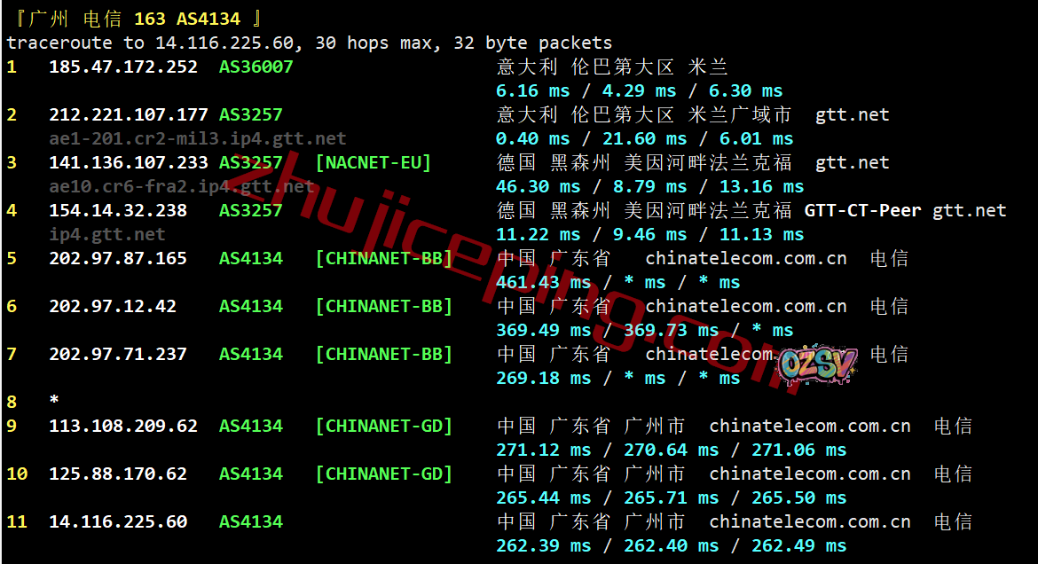 电信去程:直连电信圣何塞节点然后走GTT意大利米兰