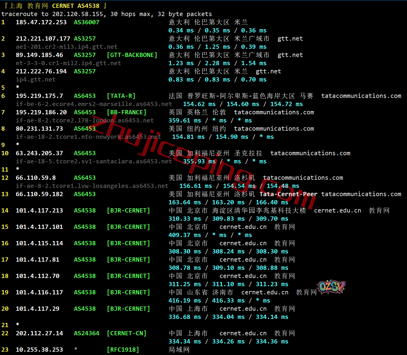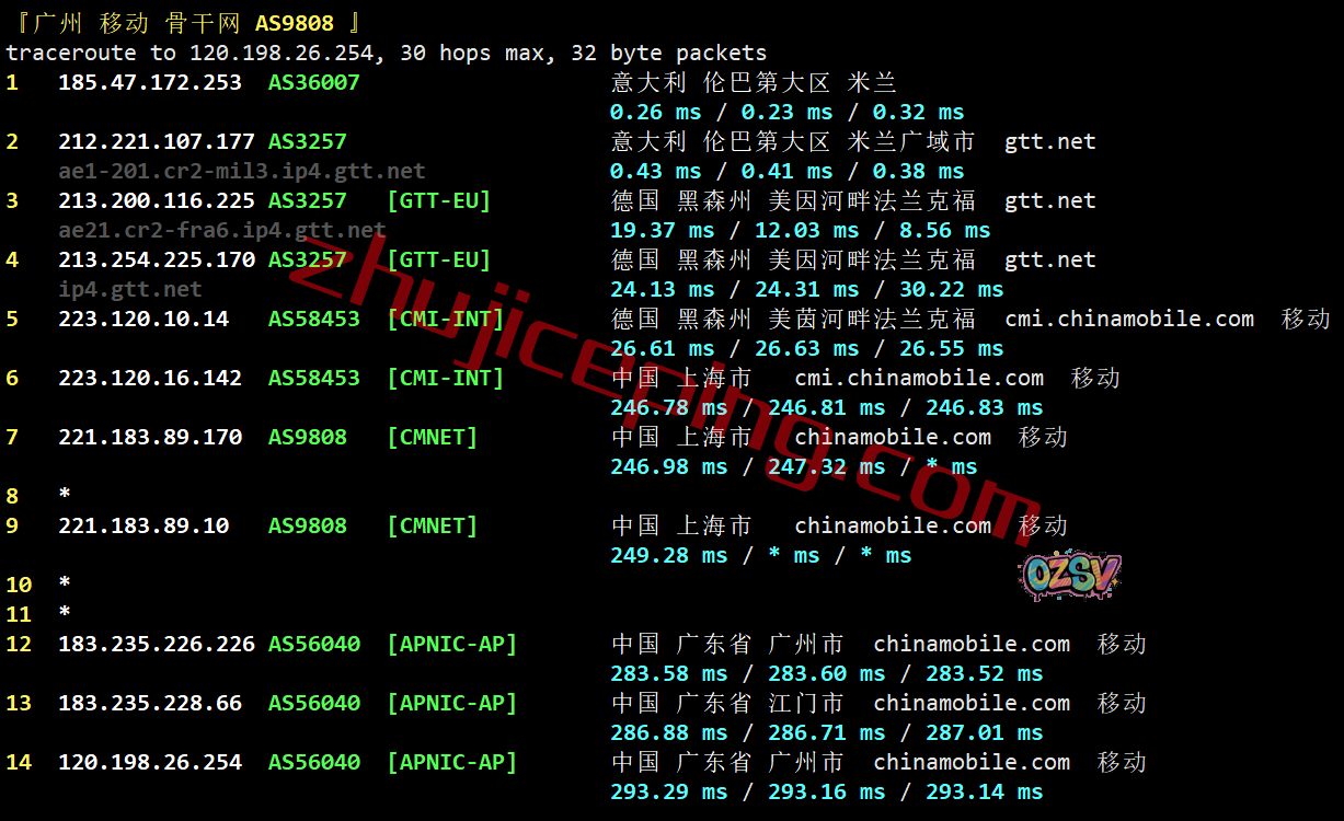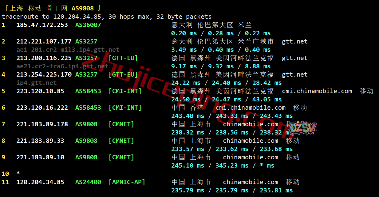 上海/广州方向:走GTT到德国,从移动法兰克福节点直连回国