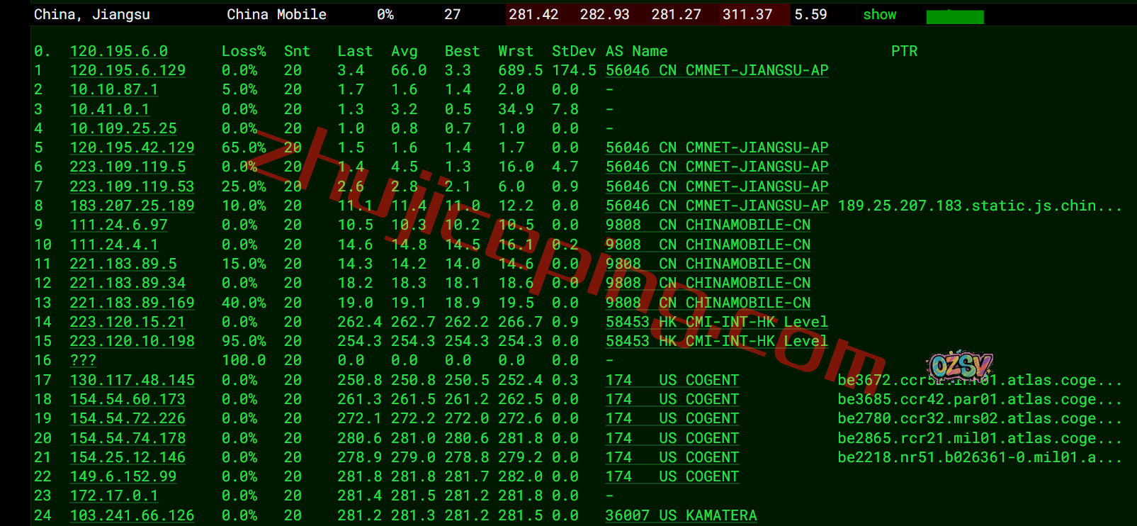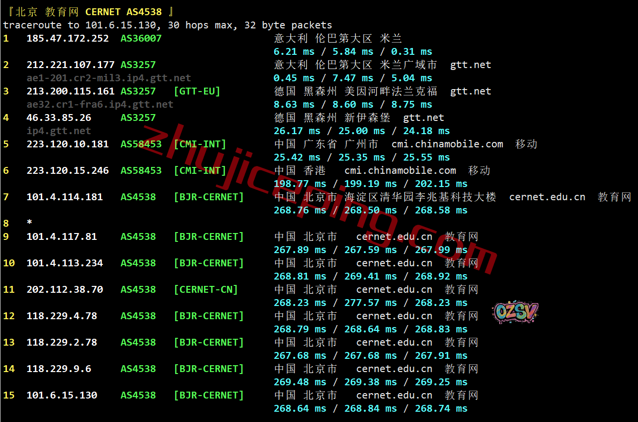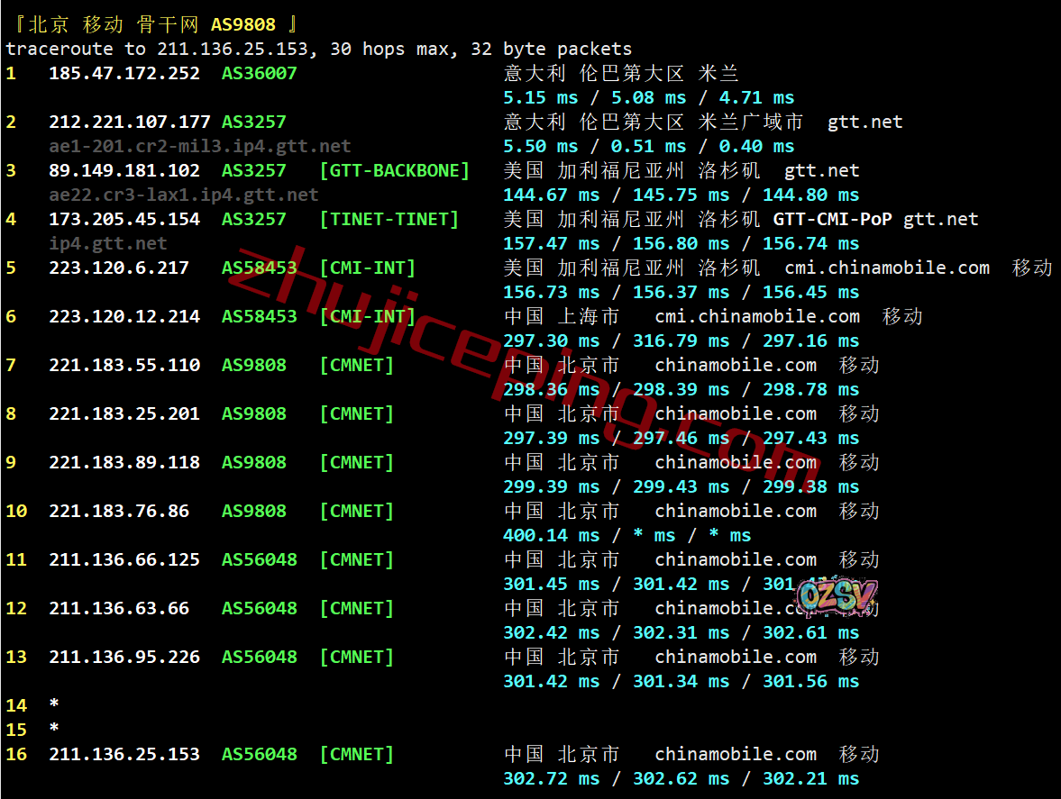 移动去程:直连移动英国伦敦节点,然后走cogent去法国再到意大利米兰