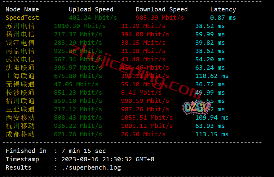默认1Gbps带宽,我们用国内三网多个节点跑一圈上下行带宽测试,大致数据如下: