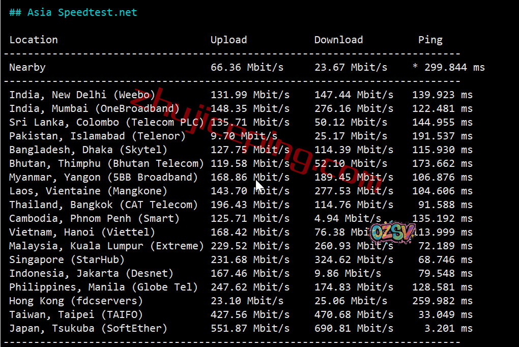 speedtest的部分亚洲区域内的节点的测试数据: