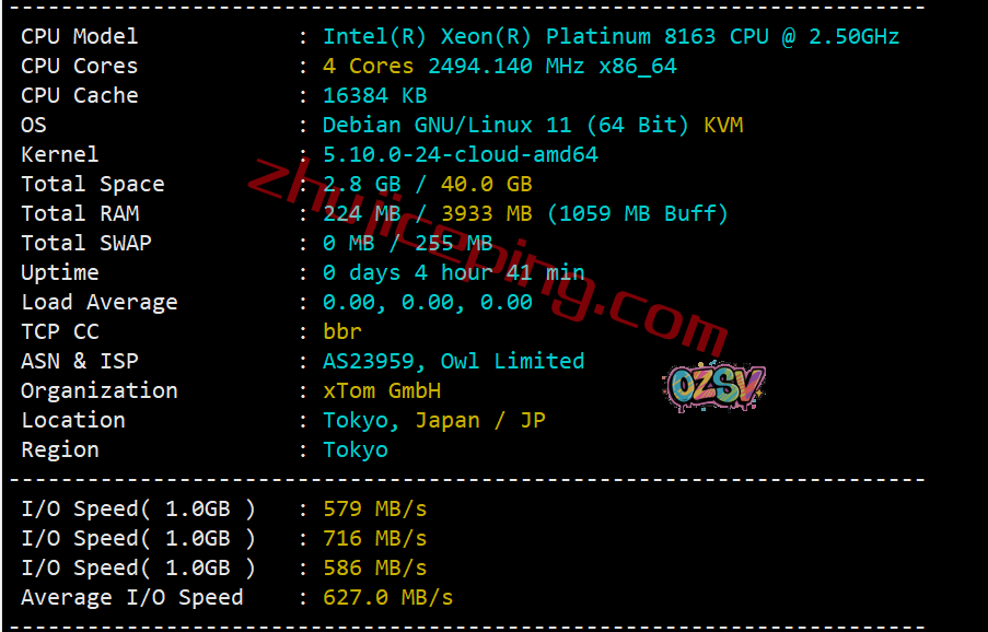 CPU为Xeon Platinum 8163(24核、48线程、主频2.5GHz、加速3.1GHz),启用了BBR,自家XTOM的网络,归属地为日本东京,当前I/O大致在627MB/S左右: