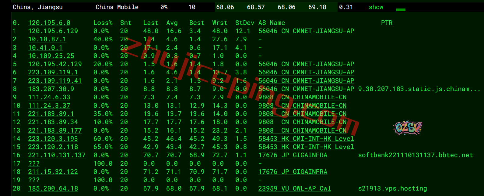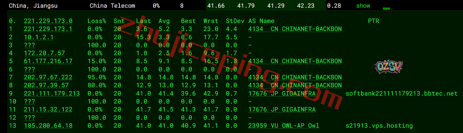 网络方面,三网去程、回程都是走的软银,效果相当好;从三网区别来看,联通应该是效果最好的。