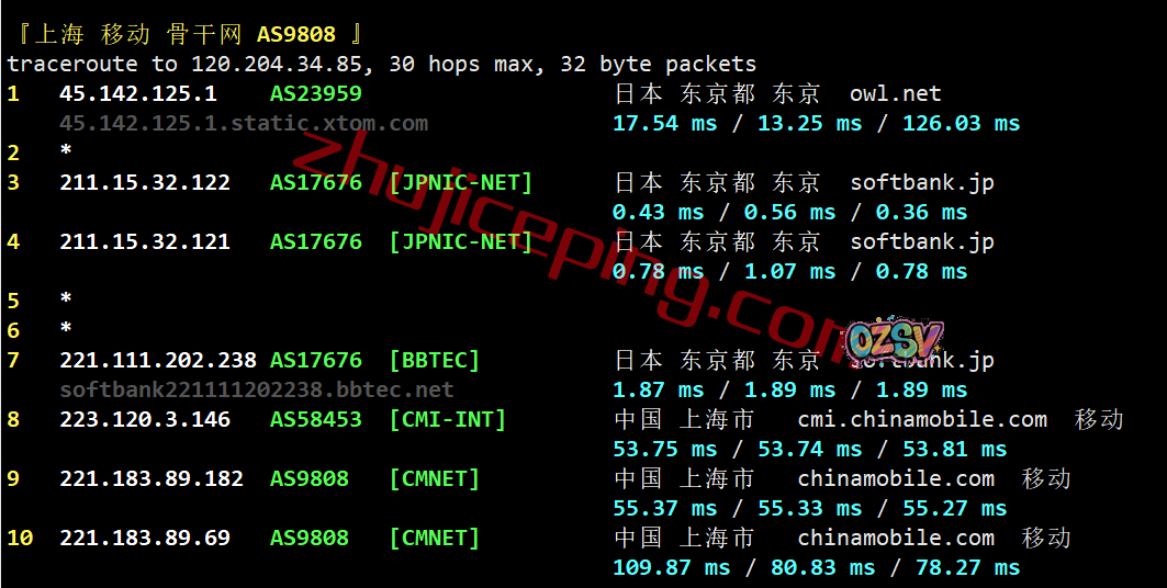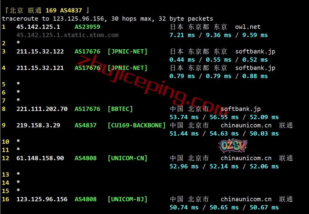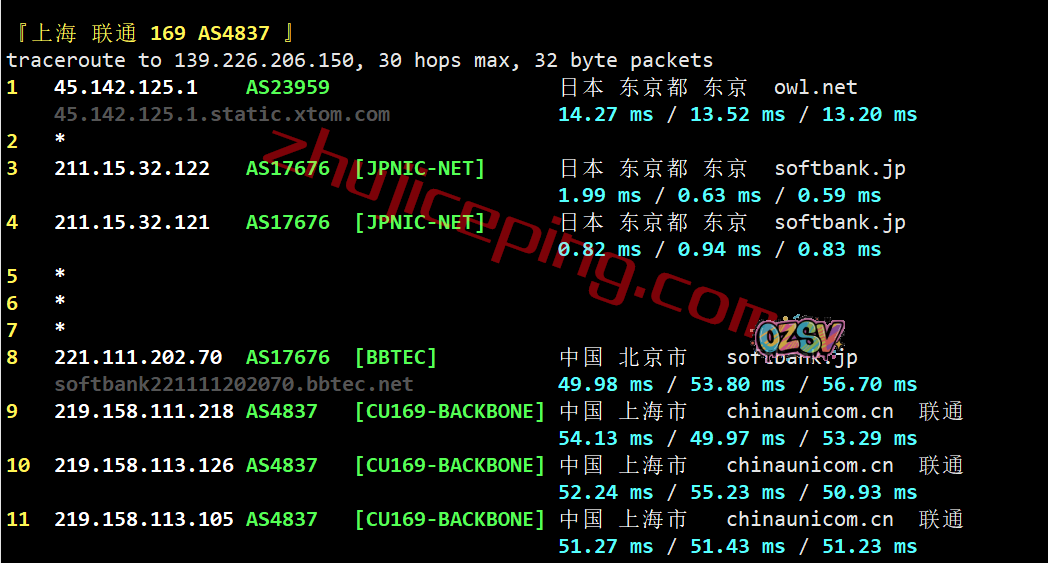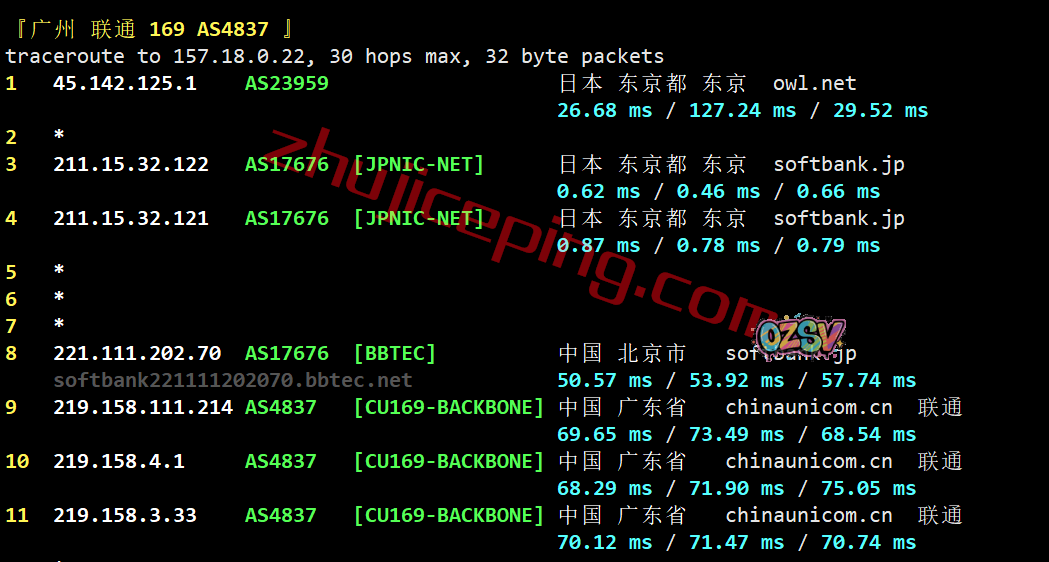 联通回程:也是走的软银线路