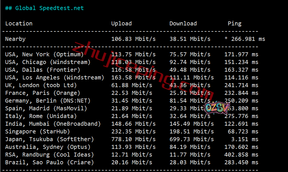 speedtest的部分国际节点测试数据: