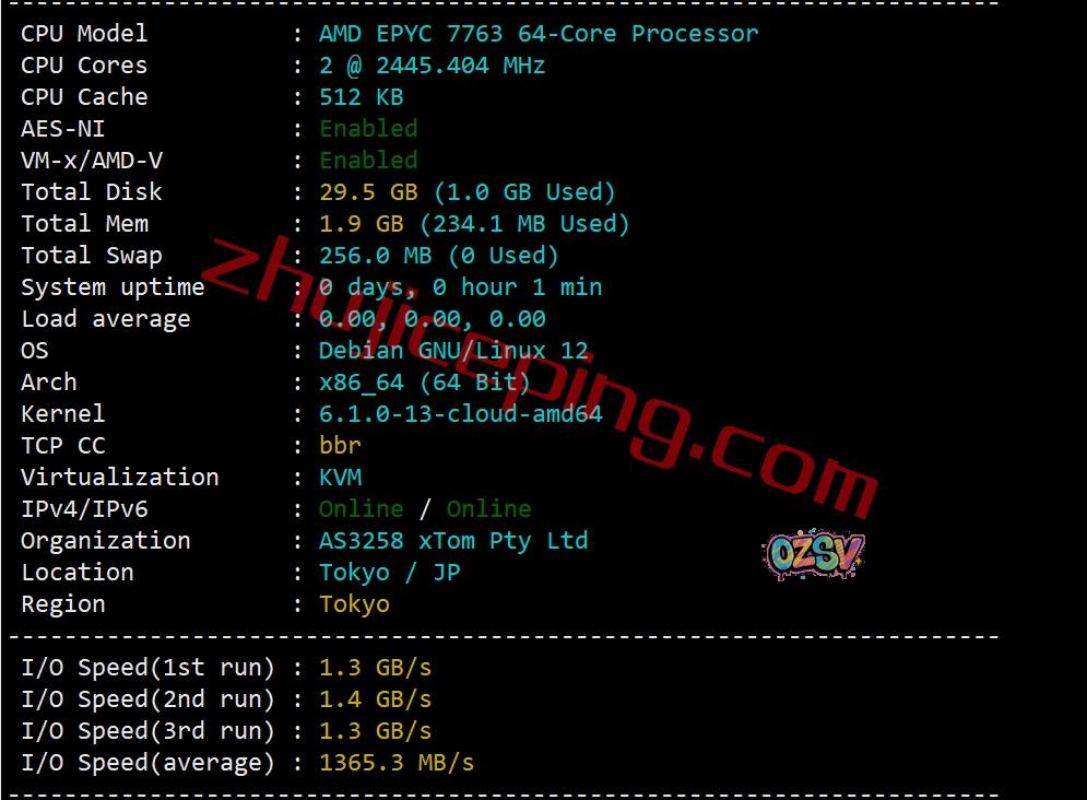CPU型号是AMD EPYC 7763(64核,128线程,主频2.45GHz,加速频率3.5GHz),支持IPv6、自家XTOM的AS,归属地日本东京,当前硬盘I/O大致1365MB/S: